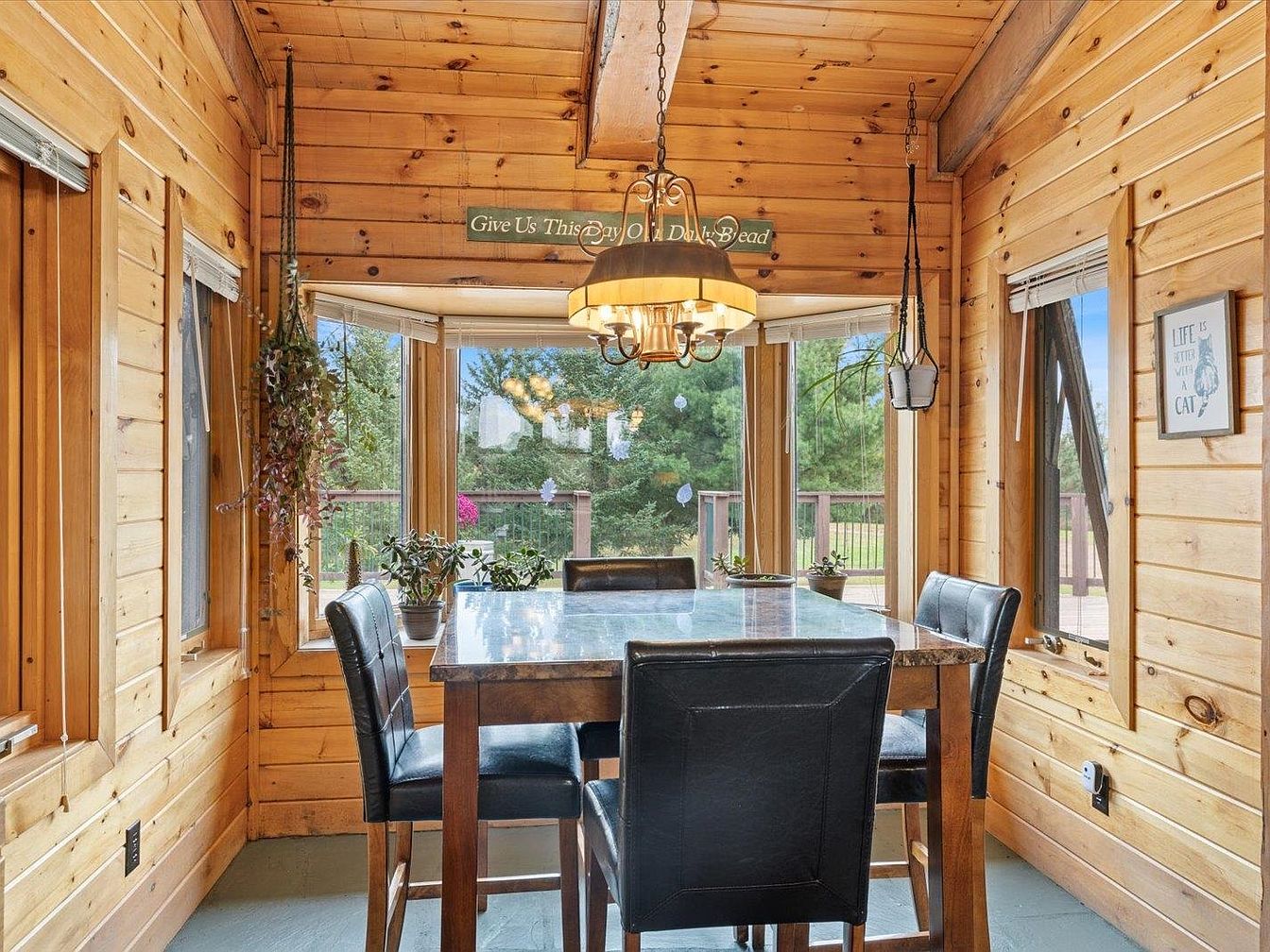 This cozy dining nook features warm, honey-toned wooden walls and ceiling, giving the space a welcoming log cabin feel. Natural light pours in through three large windows with wooded views, illuminating the room and creating an inviting atmosphere perfect for family meals. The centerpiece is a sturdy wooden dining table with a sleek, reflective granite top, surrounded by four comfortable, high-back black leather chairs. Decorative touches include a charming chandelier, hanging potted plants, a cheerful sign above the window, and wall art. The rustic ambiance combined with the practical furniture makes it ideal for relaxed family gatherings.