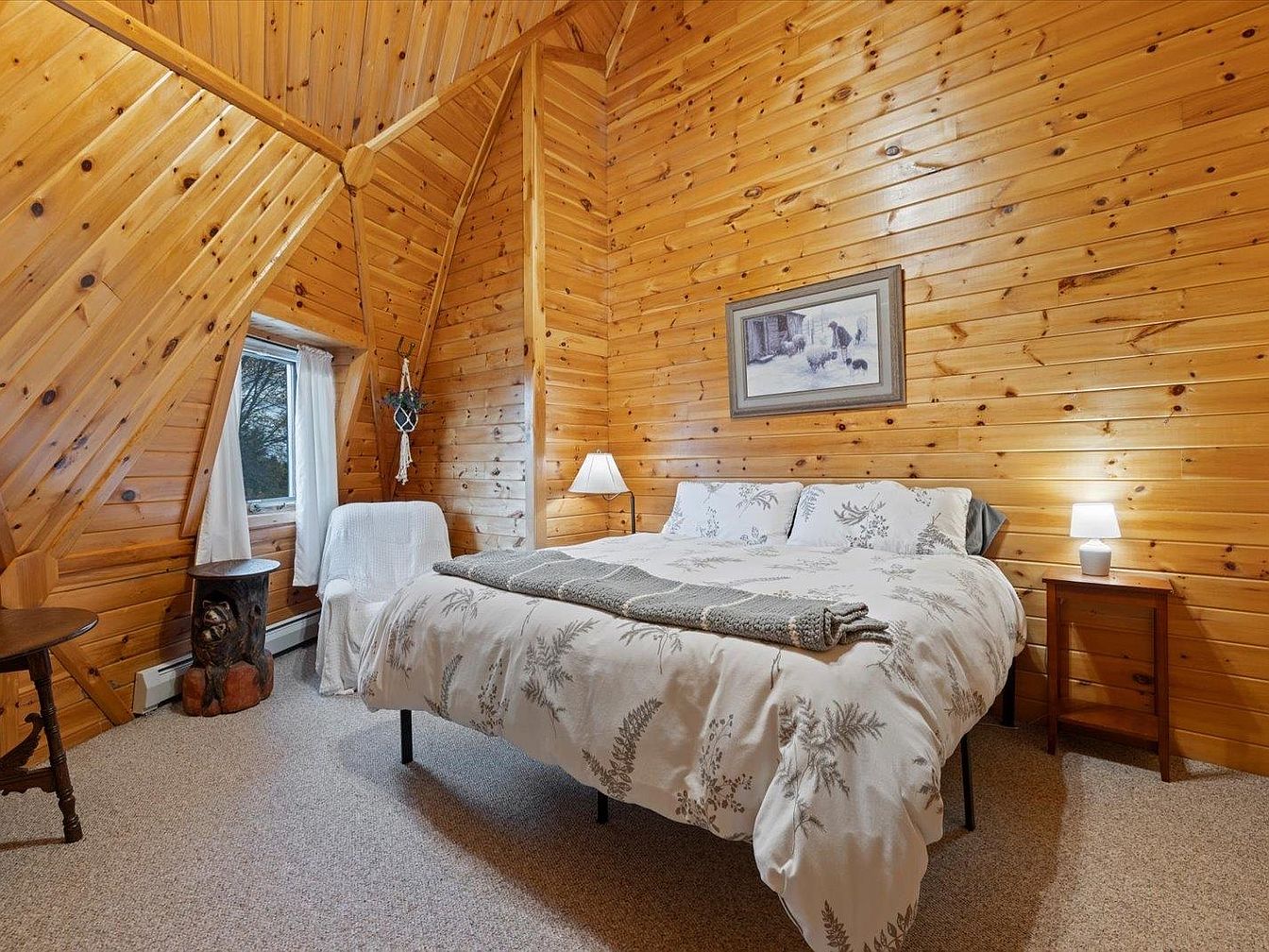 Spacious, inviting bedroom with warm wooden walls and a high, slanted ceiling, creating a cozy cabin-like atmosphere ideal for family relaxation. The centerpiece is a comfortable bed with nature-themed, white and gray bedding, flanked by wooden nightstands each topped with a softly glowing lamp. A framed winter scene painting adds a touch of charm above the bed. A cozy reading nook sits by the window, featuring a plush white chair draped in a cover and accented by a whimsical bear-themed side table. Neutral carpeted flooring and soft white curtains gently diffuse natural light, enhancing the room’s welcoming, homey feel.