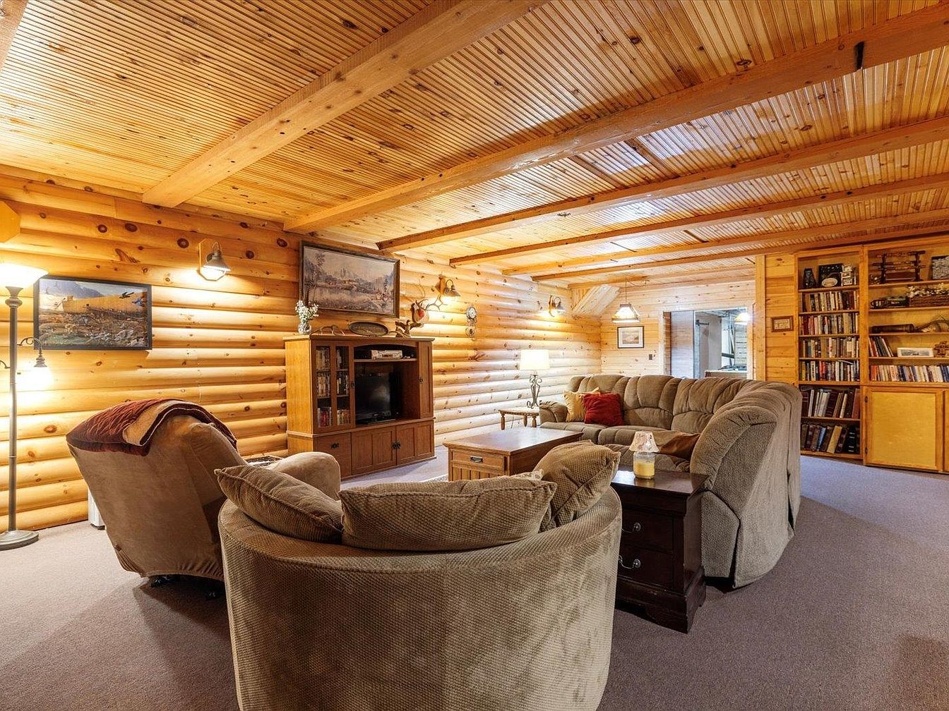 This spacious family living room offers a warm, inviting log cabin aesthetic with natural pine wood walls and exposed beam ceilings. Plush, earth-toned sectional sofas and armchairs are arranged around a central wooden coffee table, providing ample comfortable seating for gatherings. A large entertainment center houses a television and built-in storage, flanked by artwork and decorative touches. Soft, neutral carpeting covers the floor, adding to the cozy atmosphere. Built-in bookcases filled with books and games create a space perfect for relaxing or family activities. Soft ambient lighting from wall sconces and lamps enhances the room’s welcoming ambiance.