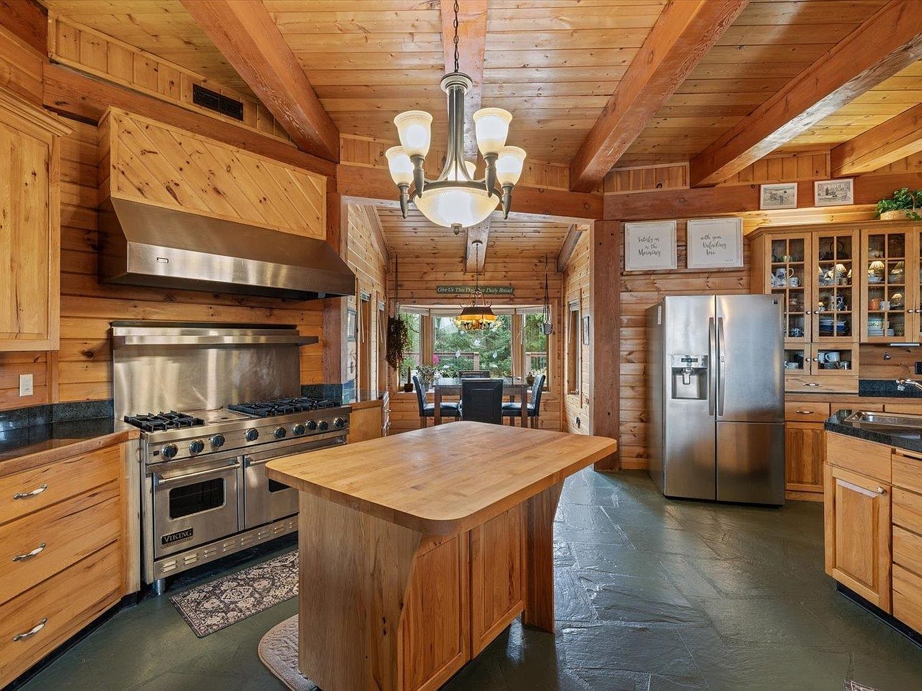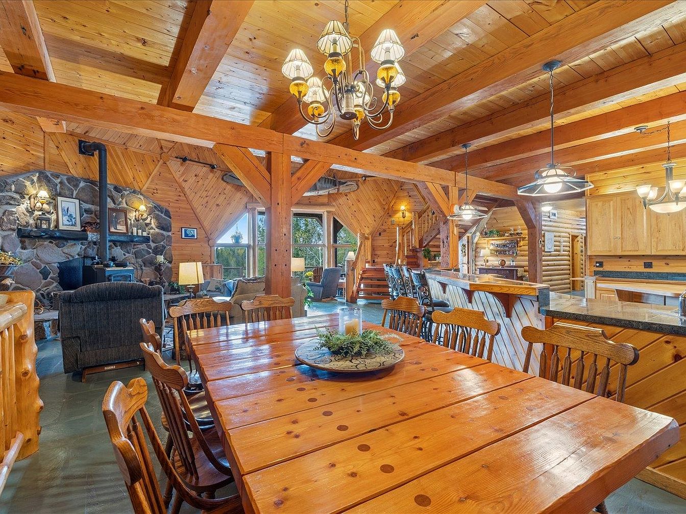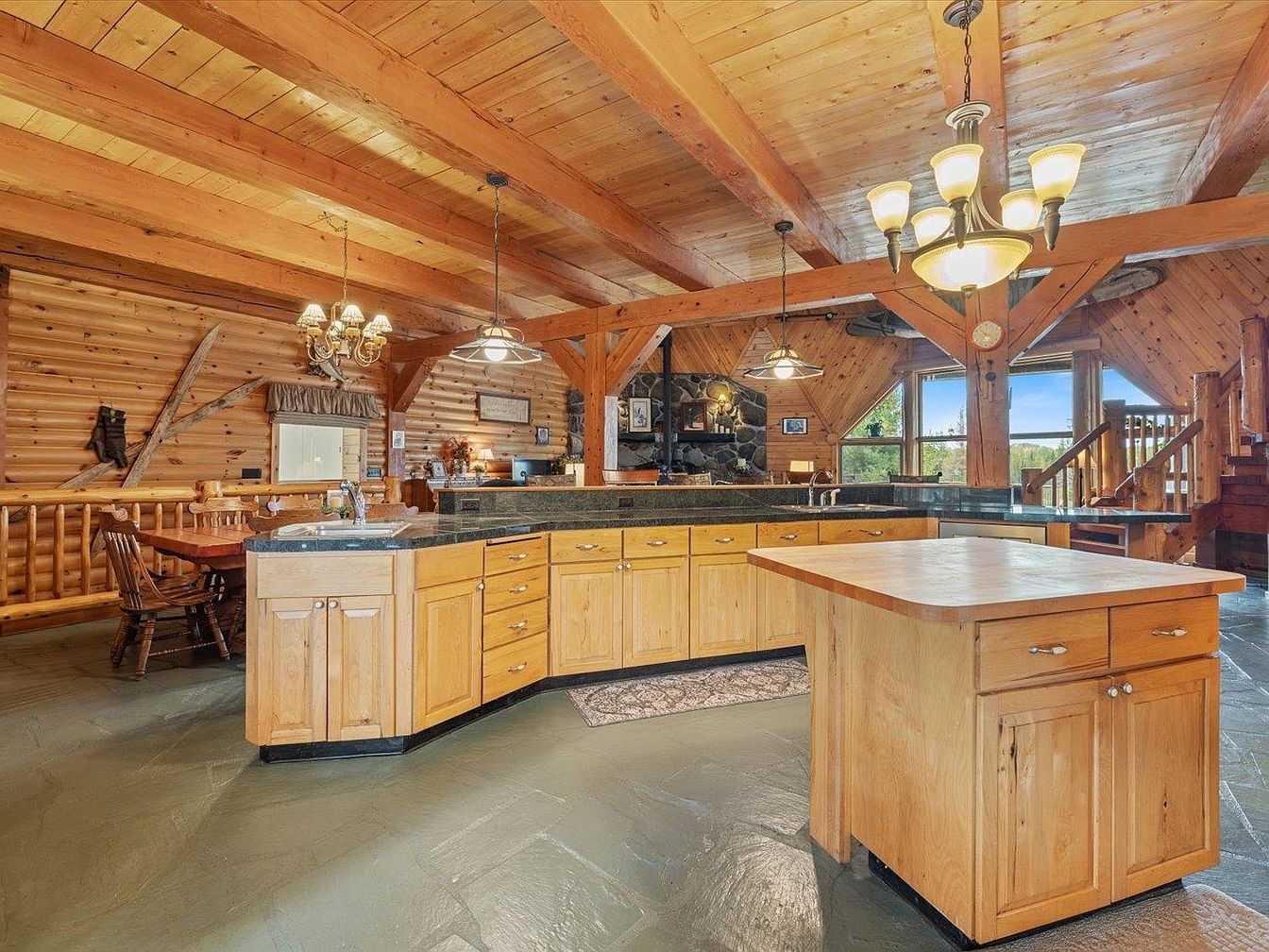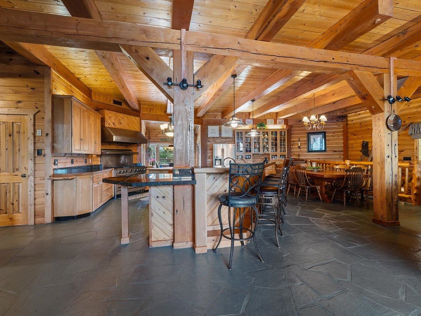 A spacious kitchen features natural wood cabinetry, a large central island, and broad stone countertops that provide ample space for family meals and gatherings. The open concept design seamlessly connects to a cozy dining area with a wooden table and chairs, perfect for family dinners. Exposed timber beams stretch across the ceiling, complementing the warm log walls and rustic décor. Large windows allow natural light to fill the space and offer scenic views. Multiple pendant and chandelier lights add a welcoming glow, while the sturdy slate flooring ensures durability for everyday family activities. The layout encourages togetherness and easy movement.