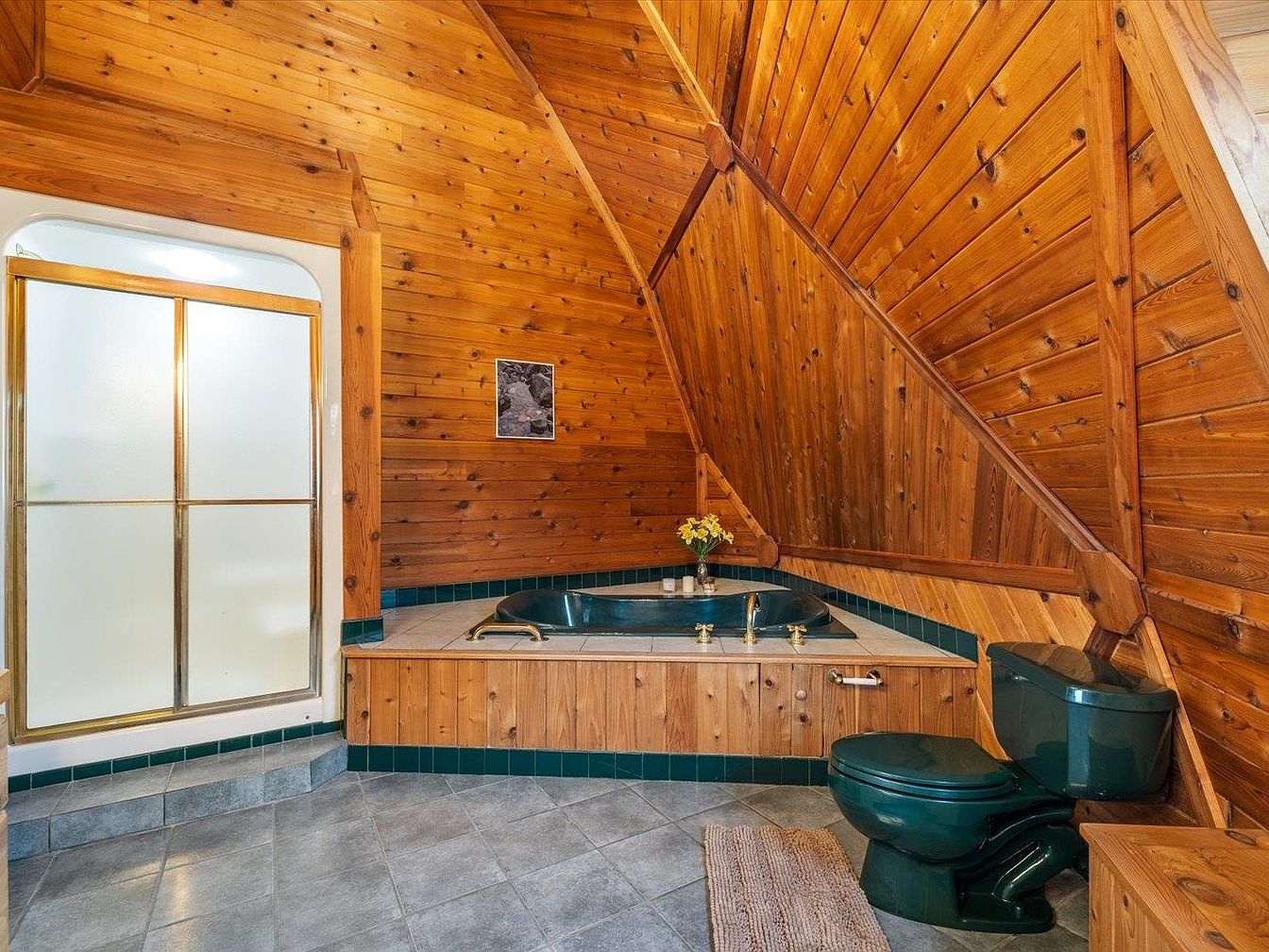 This bathroom combines rustic wood-paneled walls and ceiling with an inviting ambiance suitable for a family home. The spacious layout features a triangular alcove holding a dark green soaking tub and matching toilet, paired with brass fixtures for a touch of elegance. Slate-look gray floor tiles contrast with warm, honey-toned wood, creating a cozy yet sophisticated atmosphere. A frosted glass shower enclosure offers privacy. A soft woven rug and a shelf with flowers add comfort and family appeal, while ample open space provides safety and convenience for all ages. The angled architecture lends a unique, cabin-like charm to the room.
