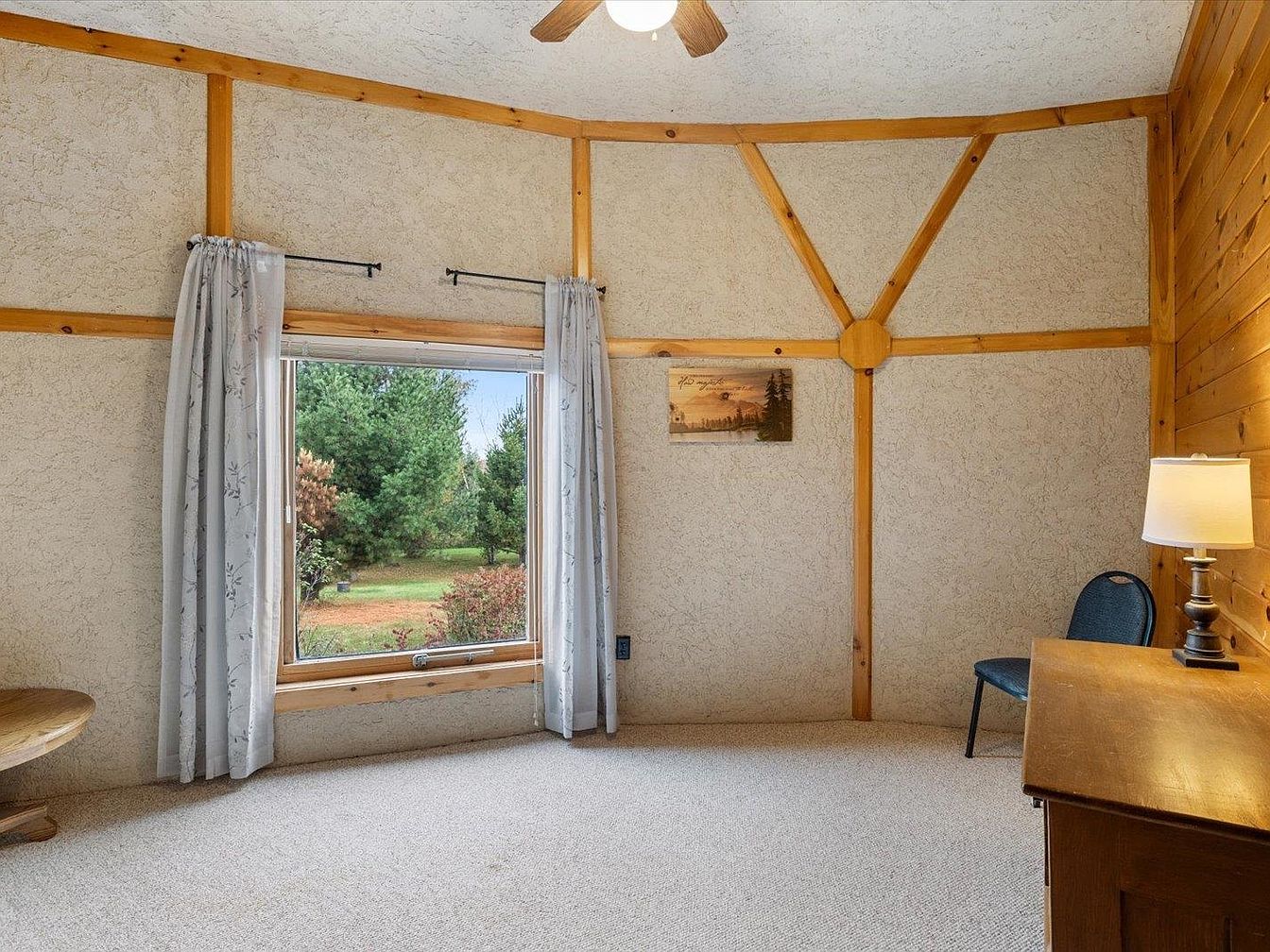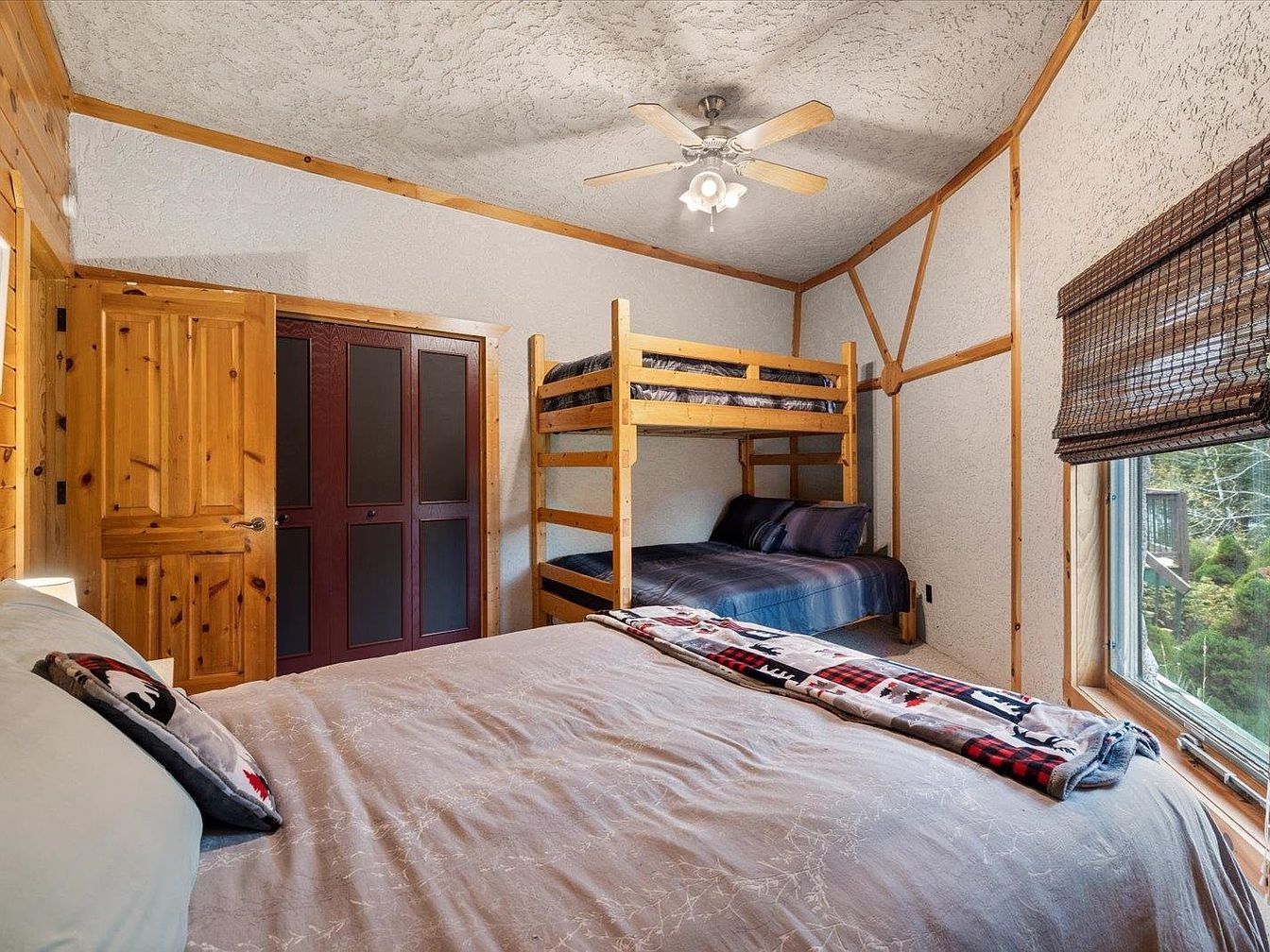 Warm and welcoming, this spacious bedroom features a queen-sized bed along with sturdy wooden bunk beds, offering comfortable accommodations for both adults and children. Natural light filters in through a large window fitted with a woven shade, showcasing scenic outdoor views. The room’s aesthetic blends rustic elegance with modern practicality, highlighted by a textured ceiling, exposed wooden trim, and knotty pine doors. Neutral-colored bedding and a soft, patterned throw enhance the cozy atmosphere. A ceiling fan provides comfort, while the ample floor space allows children to play safely, making this an ideal setup for a family-friendly retreat.