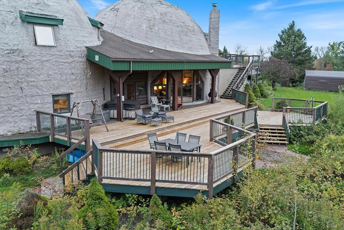 This spacious backyard deck features expansive multi-level wooden decking with stylish railings, creating several areas for relaxation and entertaining. The space is furnished with multiple seating areas, including a dining table with chairs for outdoor meals and a cushioned lounge set. The unique dome-shaped architecture of the home adds character and stands out against the lush green lawn and surrounding mature trees. Wide stairs lead to the yard and a second elevated deck. The open layout and secure railings make this area safe and enjoyable for families, while the natural wood and green trim blend seamlessly into the landscape.