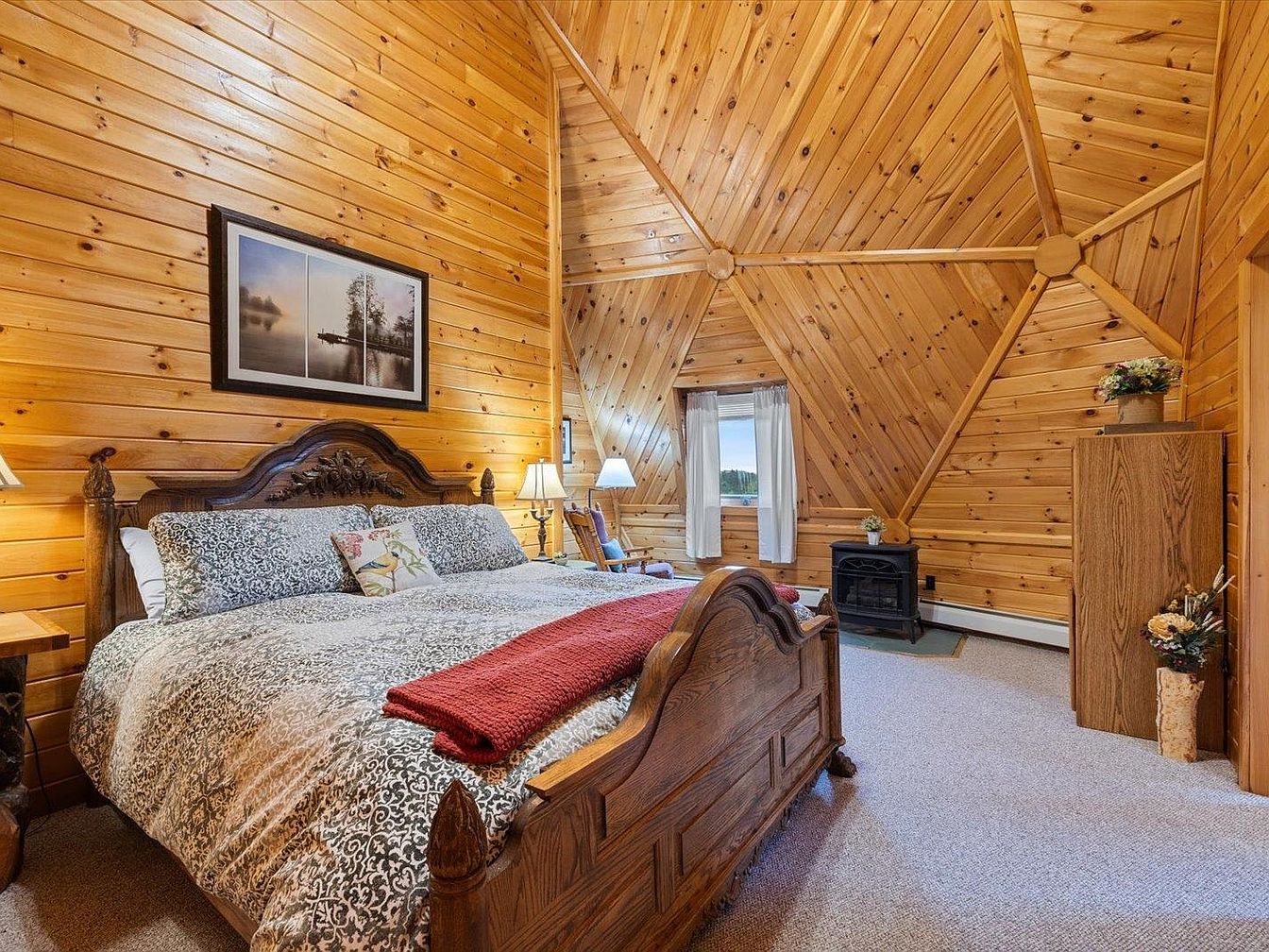 This spacious master bedroom features impressive geometric wood paneling on the walls and vaulted ceiling, creating a warm, cabin-like ambiance perfect for family living. A grand, ornately-carved wooden bed serves as the centerpiece, paired with cozy patterned bedding and a rich red throw blanket for both comfort and style. The soft, neutral carpet underfoot invites kids to play or families to gather in the mornings. Natural light streams in through curtained windows above a classic wood stove, adding a sense of snug security. Practical furniture pieces and gentle lighting complete the peaceful, inviting layout, fostering togetherness and relaxation.