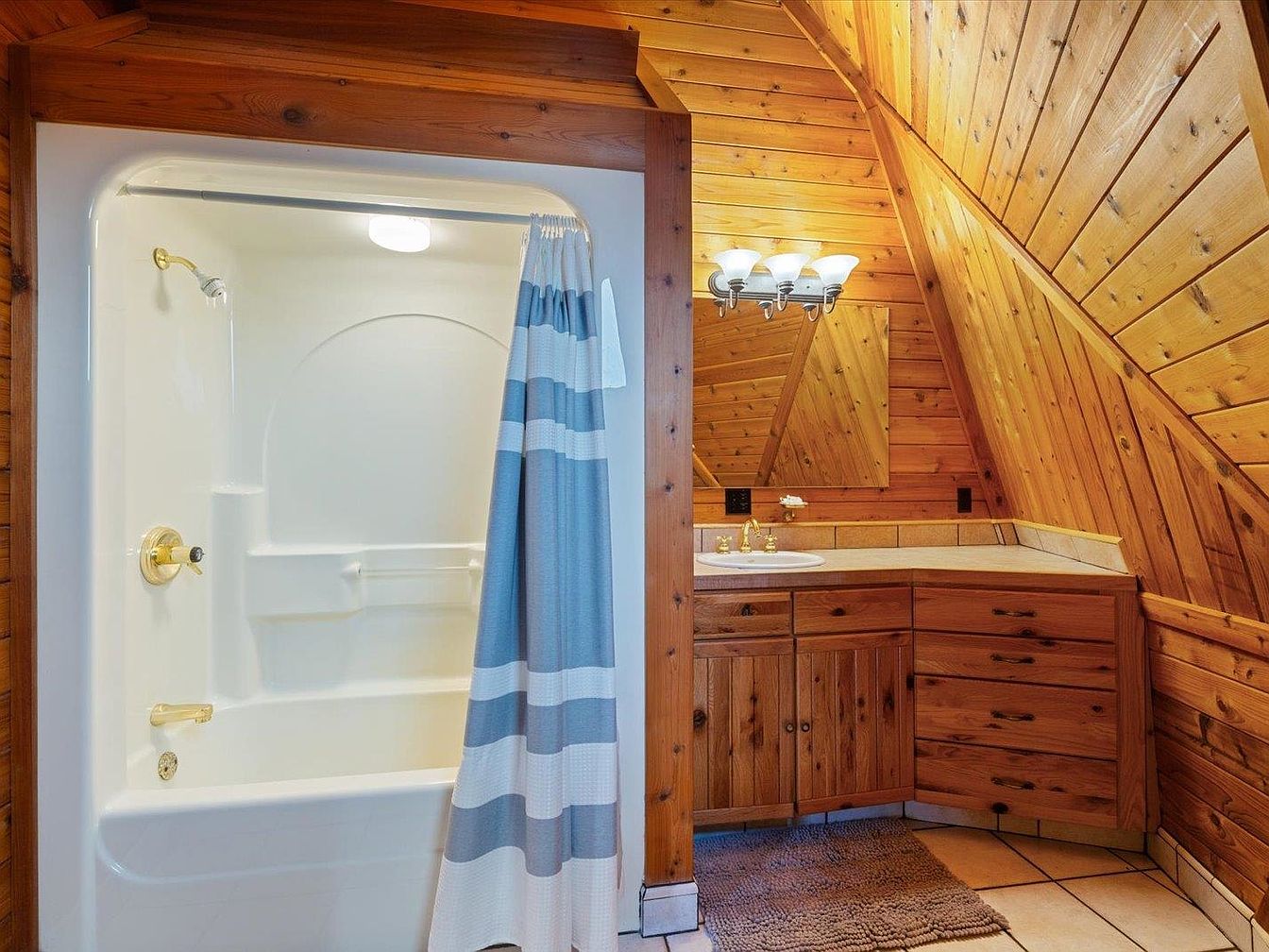 Inviting bathroom features a cozy, rustic aesthetic with warm, honey-toned wood paneling that covers the walls and sloped ceiling, creating a welcoming ambiance. A spacious white bathtub-shower combo with a gold-tone faucet stands on the left, complete with a blue and white striped shower curtain, convenient for families with children. The right side highlights a wraparound wooden vanity with ample counter space, under-mount sink, and multiple drawers for storage. Modern lighting with frosted shades illuminates the vanity area above a simple mirror. Large tile flooring and a soft brown rug provide comfort and practicality, perfect for busy families.