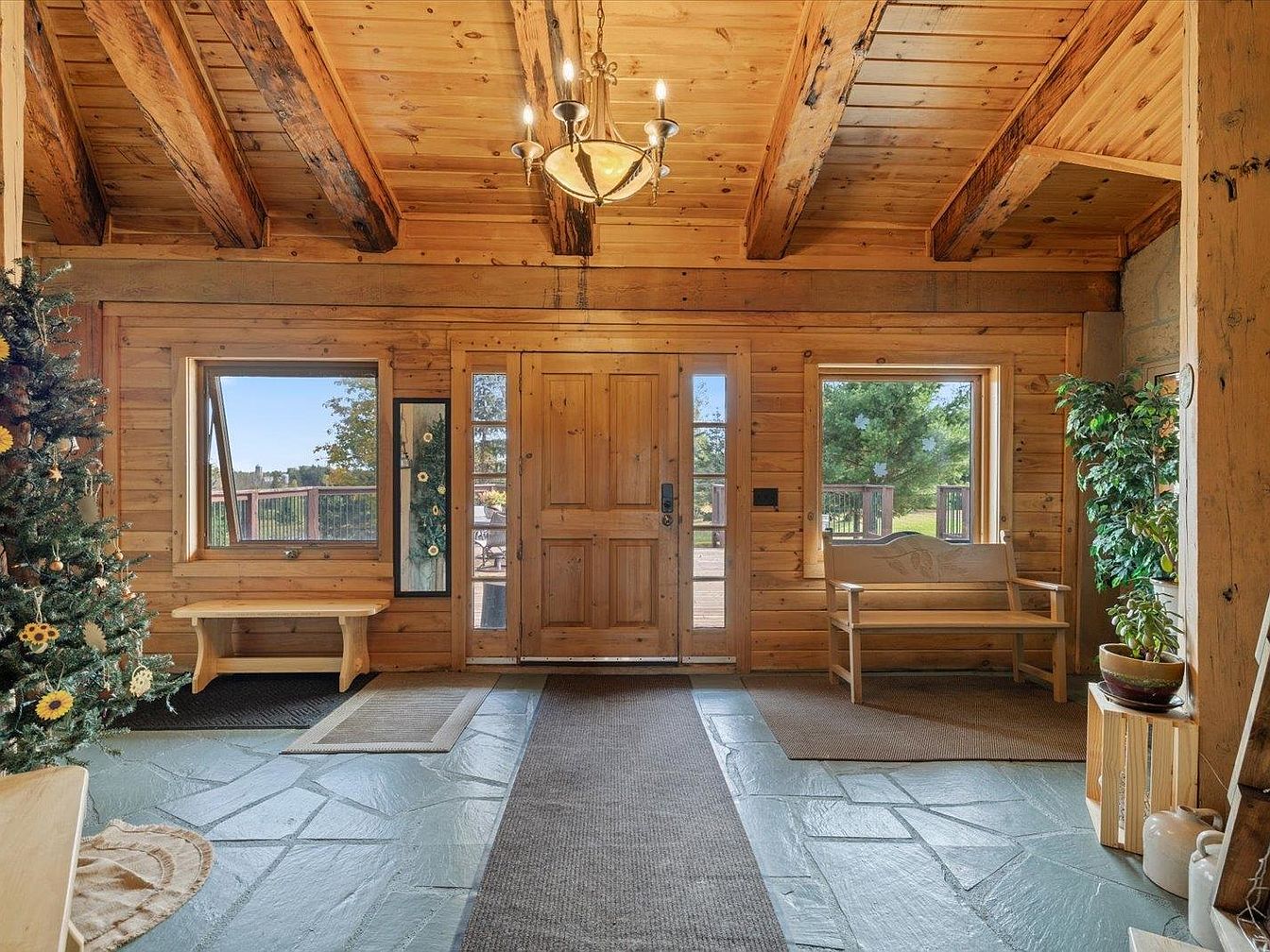A welcoming log cabin-style entryway features warm wooden walls, exposed ceiling beams, and large windows flanking a central front door that floods the space with natural light. Stone flooring with area rugs adds durability and family-friendly practicality for foot traffic. Benches line the walls under each window, providing convenient seating for removing shoes or gathering as a family. A potted plant and seasonal decorations, including a lightly decorated tree, create a cozy, lived-in charm. Soft golden wood tones and rustic accents present a homely, inviting atmosphere perfect for family living, offering both beauty and practical organization.