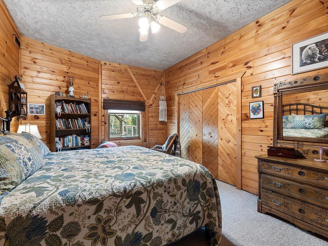 Warm wooden walls and soft neutral carpeting create a cozy and inviting bedroom space perfect for a family home. The bed is topped with a quilt featuring a green and blue botanical pattern, echoing nature and relaxation. A bookshelf filled with books and keepsakes provides both storage and a touch of personality, while a window lets in natural light and offers a view of outdoor play equipment, making the space child-friendly. The ceiling fan and textured ceiling add comfort and charm. Additional features include a dresser with a mirror, closet with chevron wood doors, and family-friendly decor throughout.