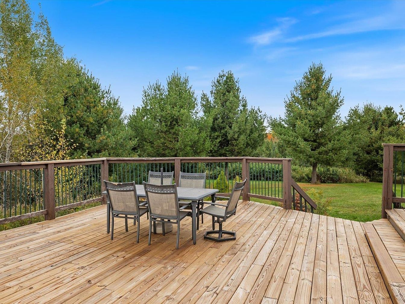 Spacious wooden deck featuring a sturdy, natural wood surface and ample space for outdoor activities. At the center, a rectangular dining table is surrounded by six metal-framed chairs with mesh seats and backs, offering a comfortable gathering spot for family meals or entertaining guests. Wooden railings with vertical black balusters enclose the deck, providing safety for children while maintaining an open, airy feel. Gentle steps lead down to a lush, green lawn bordered by mature pine trees, creating a private, scenic backdrop. The neutral wood tones and simple, functional furnishings deliver a warm, welcoming outdoor environment ideal for families.
