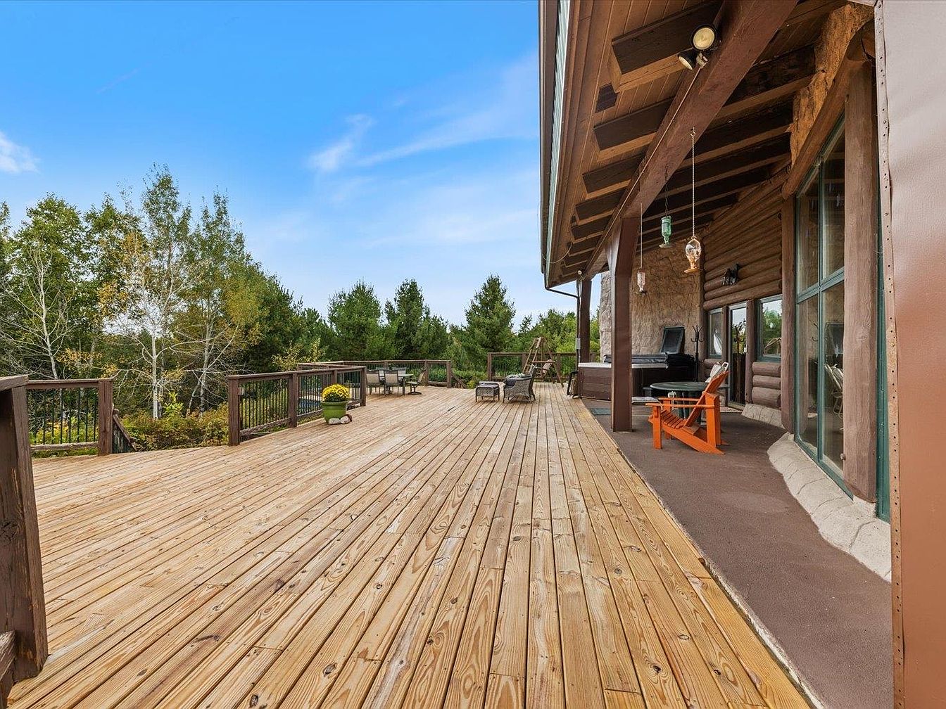 A sprawling wooden deck extends from the house, featuring wide, smooth planks that offer plenty of space for outdoor activities and family gatherings. The area includes a comfortable seating arrangement with a table and chairs, making it perfect for meals or homework with a panoramic view of lush green trees on all sides. The house exterior boasts log-cabin style walls, large windows to let natural light in, and a rich, earthy color palette with accents of deep brown beams and an orange Adirondack chair. Hanging lights and planters add charm, while the secure railing provides safety for children.