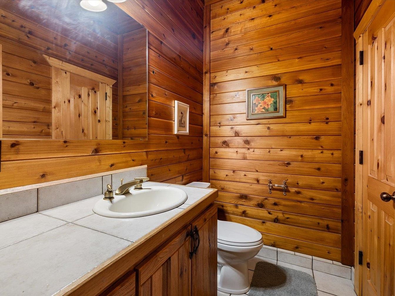 Warm natural wood tones cover the walls and cabinetry, creating a cozy, rustic bathroom space ideal for a family home. A generously sized rectangular mirror above the light-colored, tiled countertop enhances the sense of space and brightness. The vanity includes a classic white porcelain sink with brushed bronze fixtures, adding an elegant touch. Soft lighting and framed wall art offer a welcoming, homely atmosphere. The room also features a sturdy wooden door and a modern white toilet set atop easy-to-clean light tile flooring, while a plush gray rug near the sink ensures comfort and safety, making it practical for everyday family use.