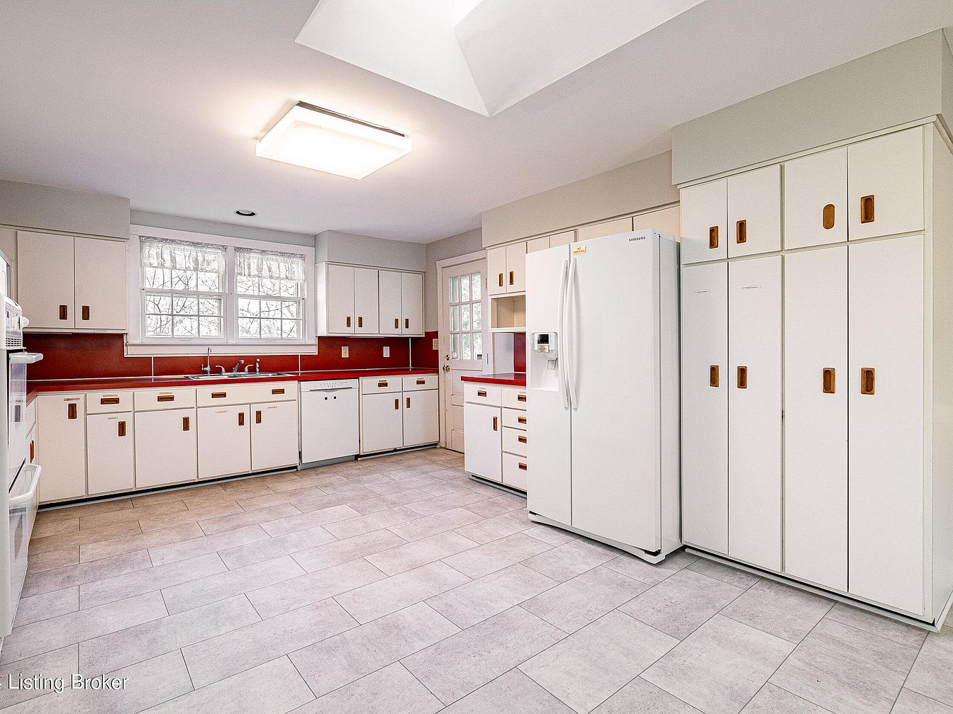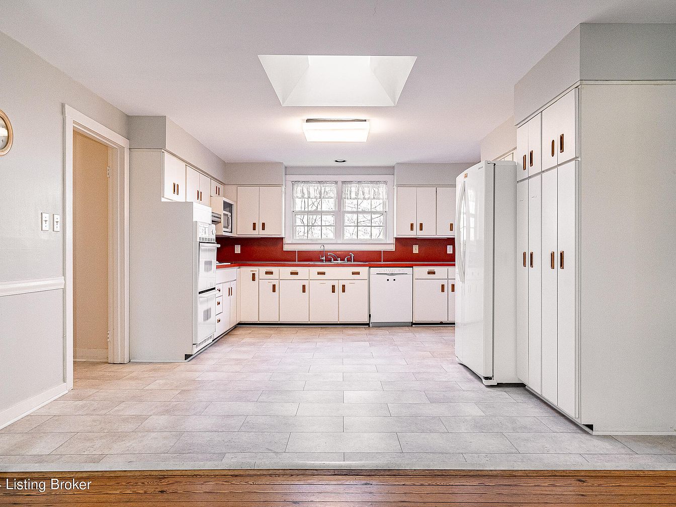 Spacious, mid-century inspired kitchen with ample cabinetry, double ovens, and white appliances spread across the far wall. Cabinets and drawers feature flat panels with simple wood pulls, all finished in white, paired against a bold red backsplash that adds a striking accent. The floor is covered in large, pale gray tiles, contrasting subtly with the adjoining wood flooring. A large window above the sink lets in natural light, complemented by a skylight and central ceiling fixture that brighten the space. Sleek, clean lines, light geometric forms, and minimal ornamentation create an understated, functional aesthetic with a retro touch.