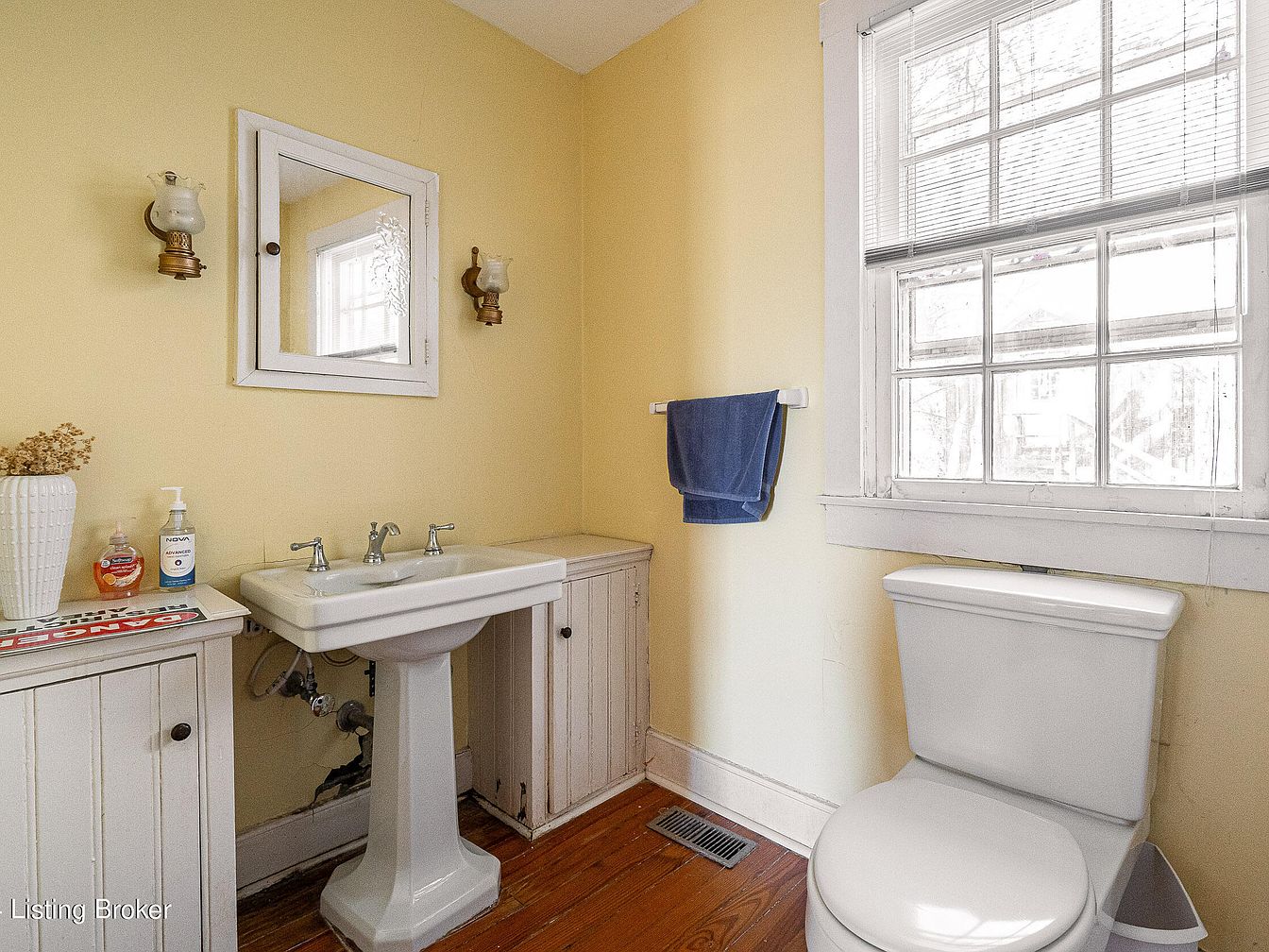 A cozy bathroom features soft yellow walls that create a warm, inviting atmosphere. The space is anchored by a classic white pedestal sink, framed by two small storage cabinets with vintage hardware. Above the sink, a white-framed mirrored medicine cabinet is flanked by two ornate brass and glass wall sconces, adding a subtle historic charm. To the side, a white toilet is positioned below a large, multi-pane window with white trim, allowing abundant natural light to brighten the room. A blue towel hangs neatly on a simple rack, and the original wood flooring adds extra character to this timeless space.