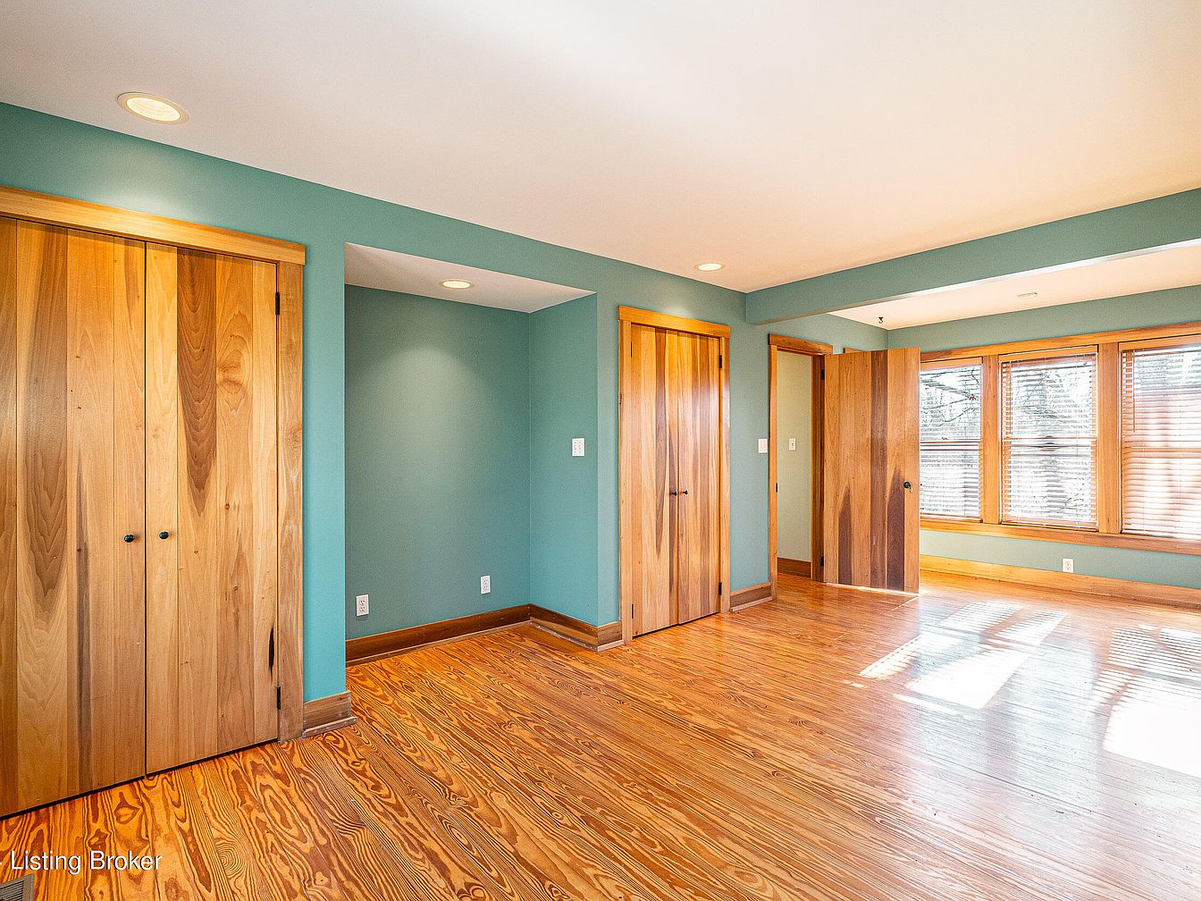 A spacious room featuring beautiful golden-toned wood floors with striking natural grain patterns. The walls are painted a calming sage green, contrasting nicely with the lighter wood trim and doors. Multiple closet doors line one wall, offering built-in storage and blending seamlessly with the trim. Soft recessed ceiling lights add gentle illumination. Large windows on one side feature wooden frames and offer generous natural light, making the space feel bright and airy. The color palette is warm and earthy, showcasing the craftsmanship and historic character of the property while maintaining a clean, uncluttered look.
