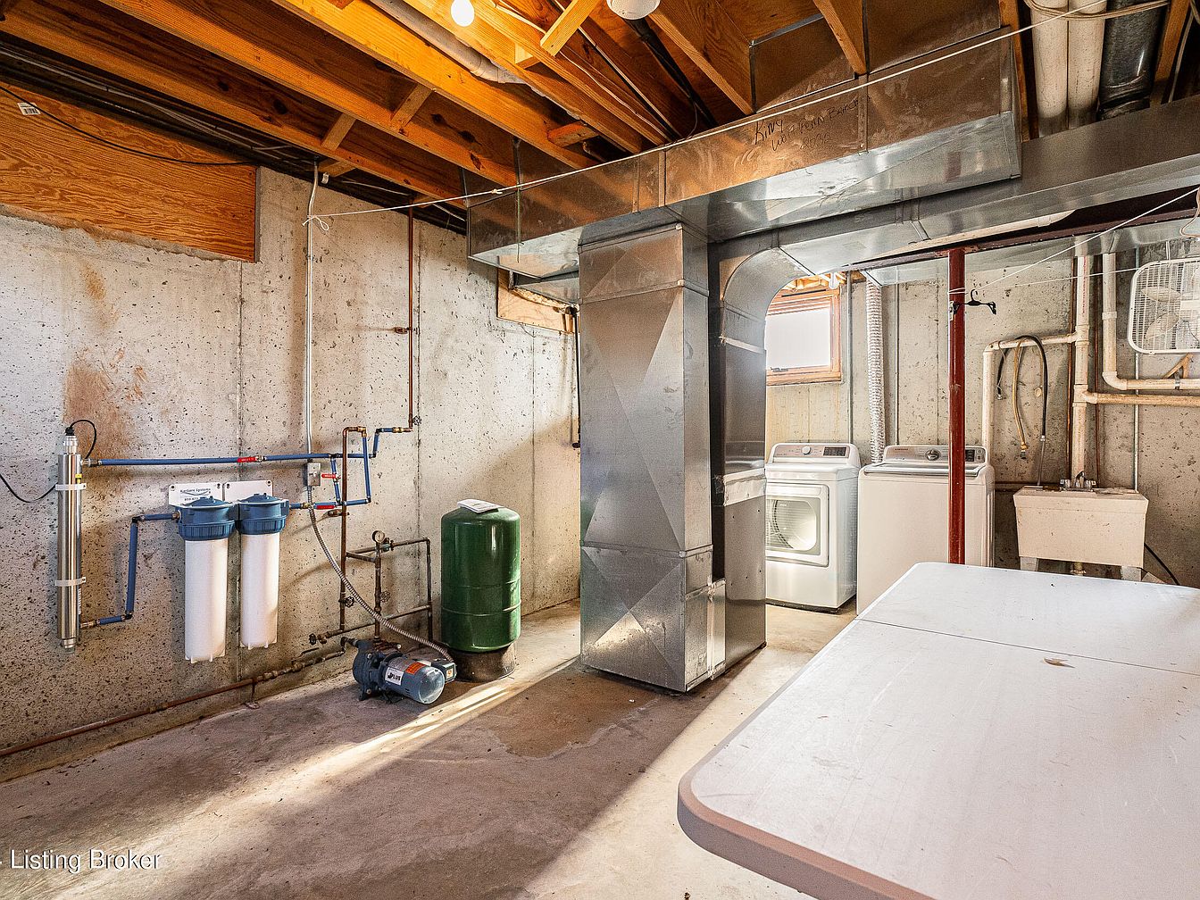 A functional basement space with exposed beams in the ceiling and unfinished concrete walls and flooring. The room features a washer and dryer positioned next to a basic utility sink beneath a small window, allowing natural light to enter. Centered is a large rectangular metal HVAC duct, and to one side is a green water pressure tank, filtration system, and pump mounted on the wall. Pipes and hoses create an industrial feel. A folding white plastic table sits in the foreground, offering workspace. The space is utilitarian, practical, and uncluttered, emphasizing function over decorative elements.