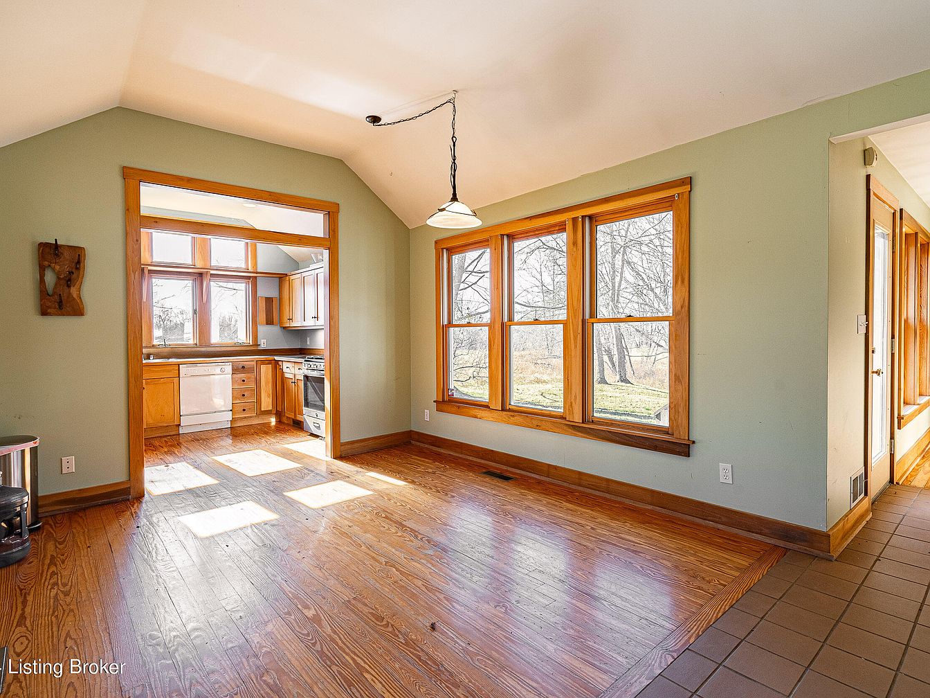 A sunlit dining space with beautiful hardwood floors and sage green walls opens directly to a cozy kitchen. Large windows with natural wood trim line one wall, offering clear views of the outdoors and filling the area with natural light. The ceiling is gently vaulted, adding to the spacious feel, while a pendant light hangs over the dining area. The kitchen features matching wood cabinetry, stainless steel appliances, and a tile backsplash. A hallway with a tiled floor and more windows is visible to the right, enhancing the open and inviting atmosphere of the space.