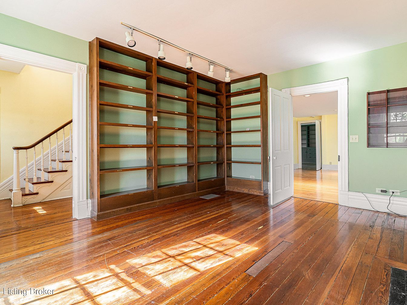 A spacious room featuring an entire wall lined with tall, built-in wooden bookshelves, under a contemporary track lighting fixture. The walls are painted a soft sage green, contrasted by rich, glossy wood plank floors that reflect natural light streaming from a window out of frame. Classic white trim frames wide doorways that lead into adjacent rooms and a staircase with white spindles and a wood handrail. The architectural details, such as ornate woodwork around the doors and the high ceiling, hint at the home’s historic character while the open, airy feel and light palette add a sense of calm.