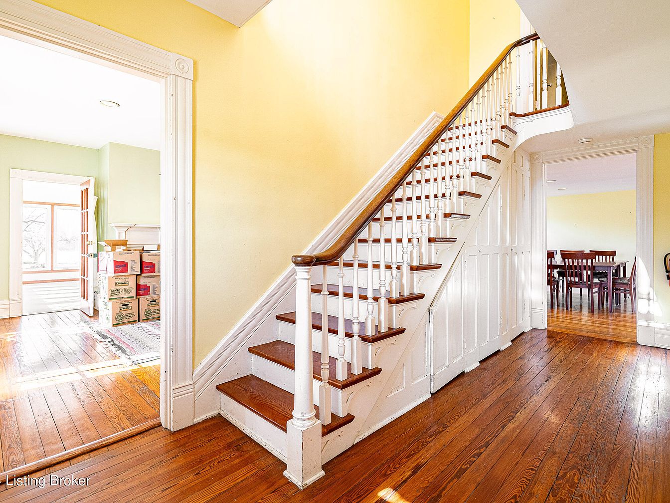 A wide central hallway with rich, honey-toned hardwood floors, highlighted by an elegant staircase ascending along the right wall. The staircase features white spindles and a polished wooden handrail, offering a classic look. Soft yellow walls brighten the space, complemented by tall white trim around the doorways. To the left, an open doorway leads to a sunlit room with pale green walls and stacked moving boxes, while straight ahead, another room is visible, furnished with a dark wood dining set. The space feels open and airy, with abundant natural light streaming across the floors and creating a warm, welcoming atmosphere.