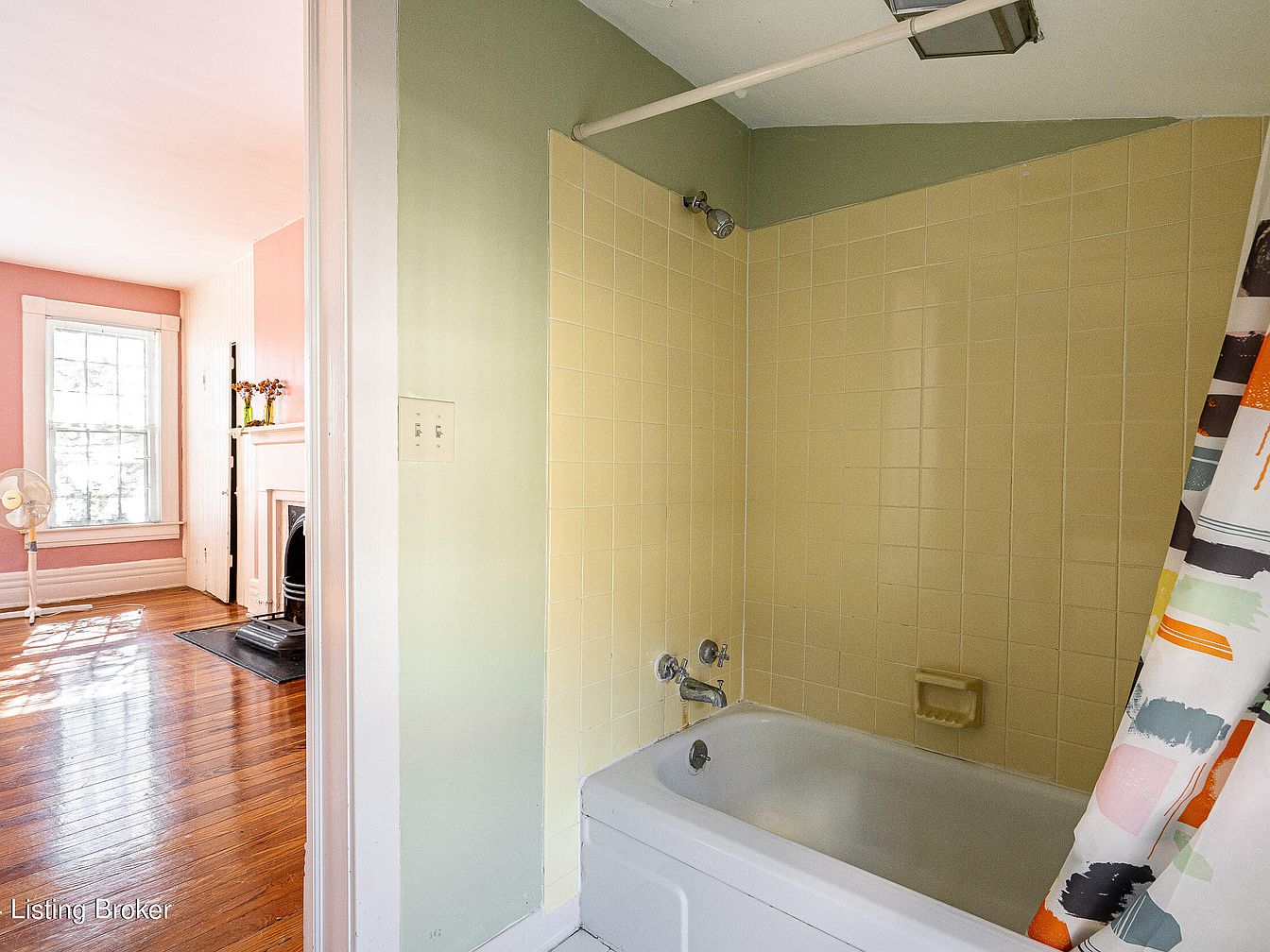 A small bathroom with a yellow-tiled bathtub and shower is positioned to the right, featuring a patterned shower curtain partially pulled aside. The walls above the tiles are painted sage green, complementing the room’s pale hues. Just beyond the bathroom doorway, a sunlit room with polished wood floors and rose-pink walls comes into view. A large window lets in natural light, creating a bright, airy feel. The room includes a white fireplace mantel, a small bouquet of flowers, and a floor fan, highlighting the home’s historic charm and soft pastel color palette. Clean, classic trim completes the look.