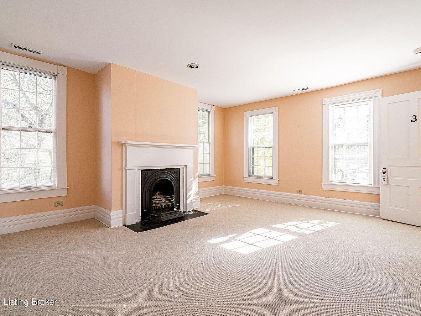 A spacious room with light peach walls and plush beige carpet, featuring three tall, white-trimmed windows that fill the space with natural light. At the center of one wall is an ornate black fireplace with a white wooden mantle, offering a charming historic focal point. Wide white baseboards and crown moldings add classic elegance, while a solid white door with the number ‘3’ on it stands in the corner, suggesting multiple rooms nearby. The soft, warm color palette and abundance of sunlight create an inviting and tranquil atmosphere, enhanced by architectural touches that reflect an older American home style.