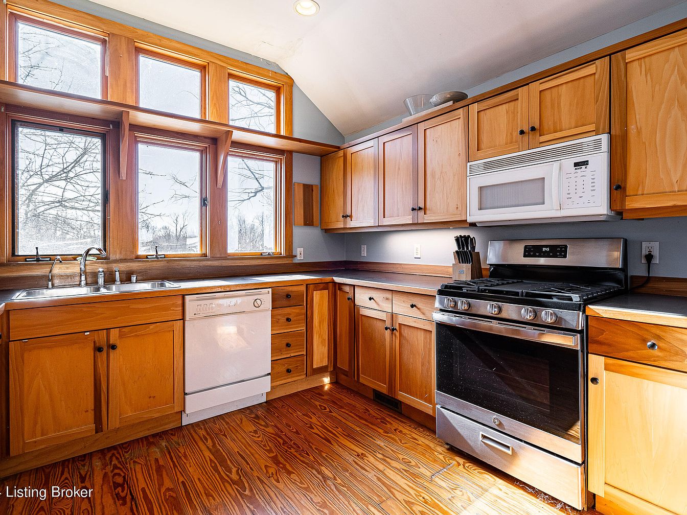 Warm, honey-toned wood cabinets fill the walls below and above a row of large picture windows, bringing abundant natural light into the kitchen. The window trim and cabinets match, creating a cohesive look. A double stainless steel sink sits beneath the windows, flanked by a white dishwasher and spacious wood drawers. A stainless steel gas oven and stove with a built-in microwave above offer a modern touch. The countertops are a sleek, dark material, contrasting subtly with the woodwork. Blonde wood floors, with a rich natural grain, add character and warmth to the space, complementing the peaceful, country feel.