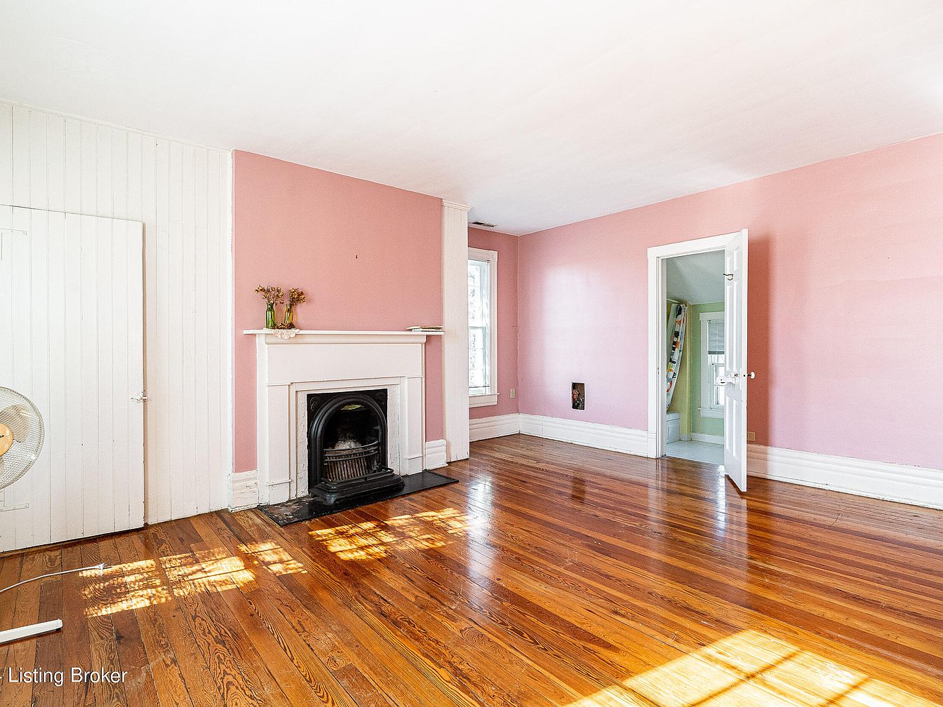 Sunlight streams across polished wood floors in a spacious room with soft pink walls, creating a warm and serene atmosphere. An elegant white fireplace, accented by a simple black mantle and hearth, serves as the focal point. Above the mantel, a small glass vase of dried flowers adds a delicate vintage touch. White vertical paneling covers one wall, providing textural contrast. A door leads to a smaller, light-filled adjoining space with cheerful pastel tones. Wide baseboards and tall windows highlight the historic character, while overall simplicity and gentle color palette evoke comfort and understated charm.