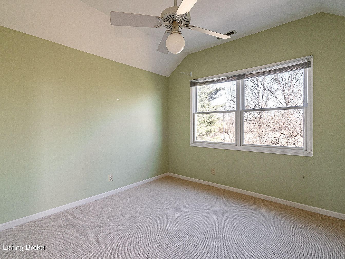 A quiet bedroom space featuring muted sage-green walls and off-white trim. The room is carpeted with a light beige material that adds softness underfoot. High ceilings create an airy feel, accentuated by a ceiling fan with a globe light fixture at the center. A large, double-pane window fills the far wall, letting in ample daylight and offering a view of bare winter trees just outside. The wall under the window holds two power outlets, and the overall look is minimal and calming, with a soothing pastel palette and simple, clean lines that suggest a tranquil personal retreat.