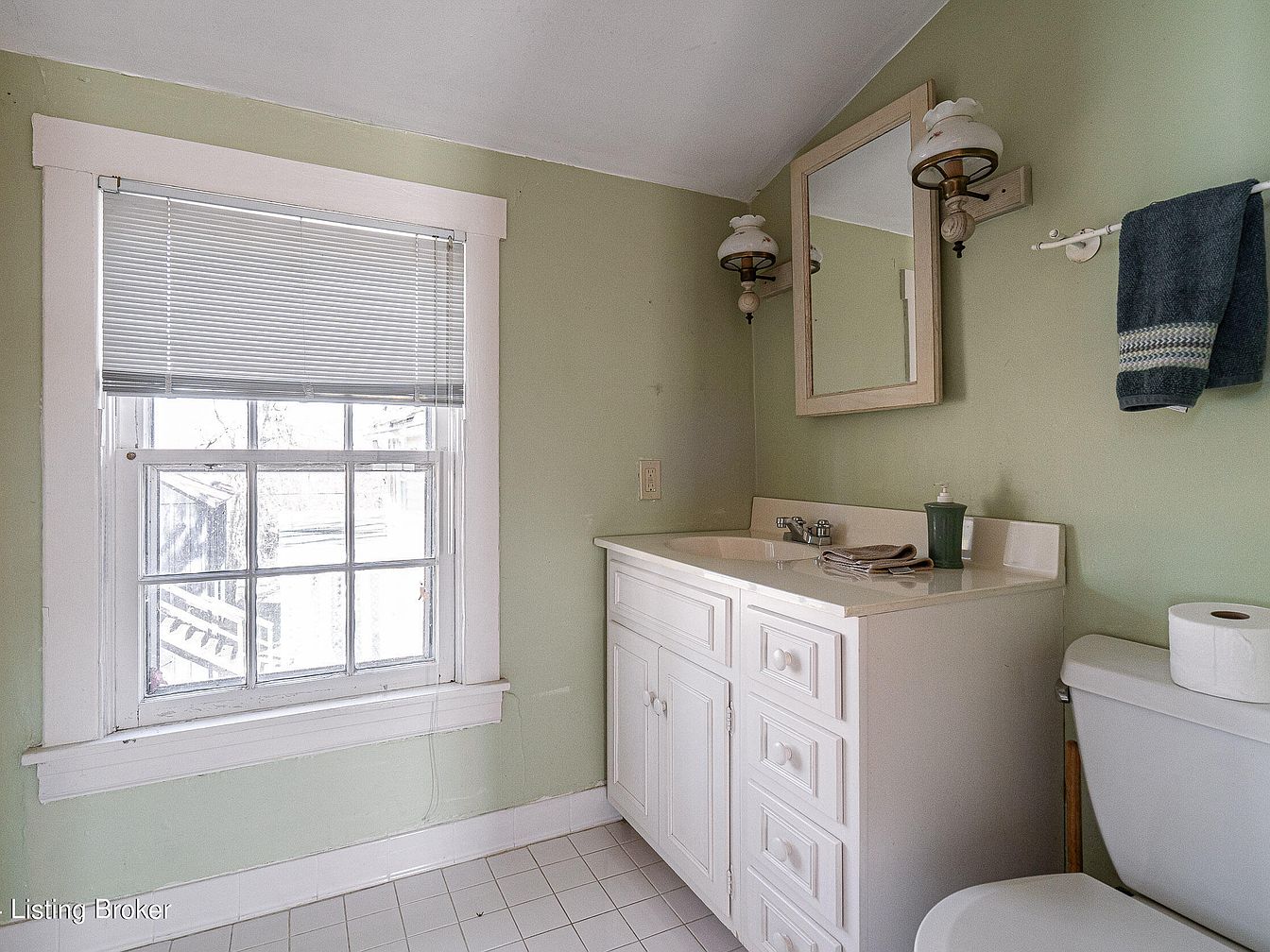 This space features a classic bathroom with pale green walls and white trim, evoking a calm and clean atmosphere. A large window allows natural light to brighten the room, while a white vanity with paneled cabinet doors provides ample storage beneath a cream-toned countertop. Above the sink, a simple rectangular mirror is flanked by two vintage wall sconces with frosted shades, adding traditional charm. To the right, a towel bar holds a dark, textured towel, and a matching white toilet sits neatly beside the vanity. The ceramic tile floor continues the neutral palette, complementing the understated, historic aesthetic.