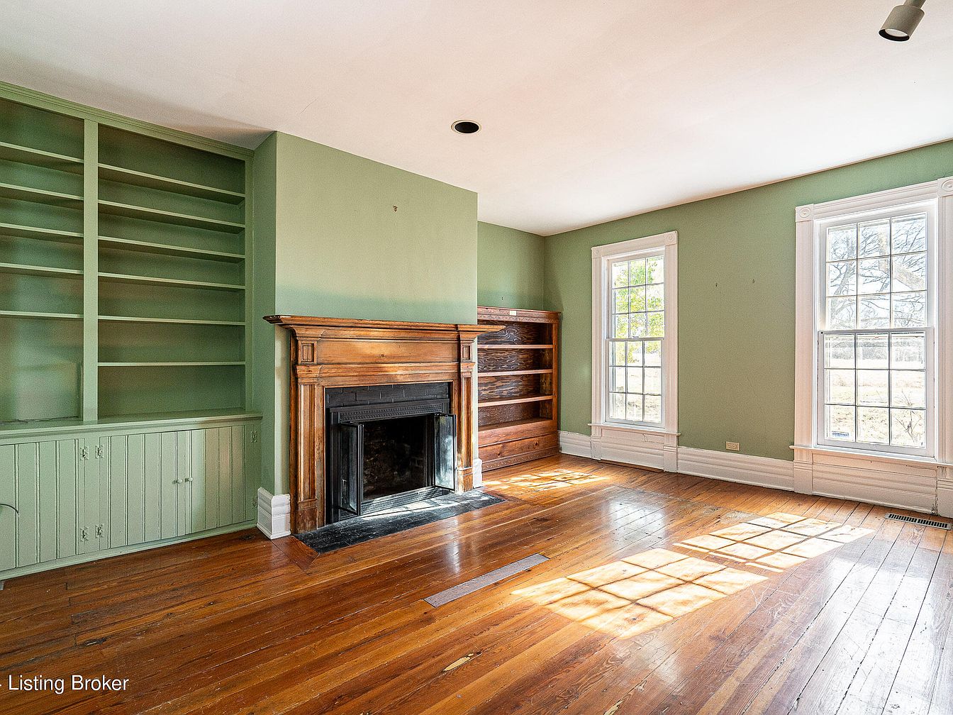 A bright and spacious living area features glossy hardwood floors and two large, white-trimmed windows that let natural light flood the room. The focal point is an ornate wooden fireplace mantel with a dark insert, flanked by built-in shelving units. The shelves on the left are painted a soft sage green that matches the calming wall color, while the shelves on the right are stained wood, providing a subtle contrast. Decorative white crown molding and baseboards frame the room, lending a classic, historic feel. The atmosphere suggests understated elegance with a muted, natural color palette.