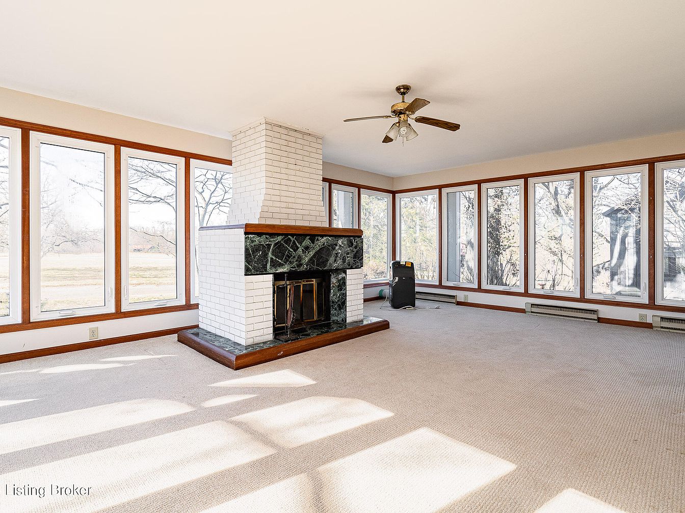 Spacious living room with a central white brick fireplace featuring dark marble accents around the hearth. Large windows form almost uninterrupted walls on two sides, framed with warm wood trim, creating a sunlit, airy atmosphere and offering expansive views of the outdoors. The ceiling is smooth and painted off-white, with a brass and wood ceiling fan as a central fixture. Light beige carpet covers the floor, contributing to a soft, neutral color palette. Minimal furniture and decor allow architectural features—such as the fireplace and wall-to-wall windows—to be the main visual elements, emphasizing a clean, inviting aesthetic.