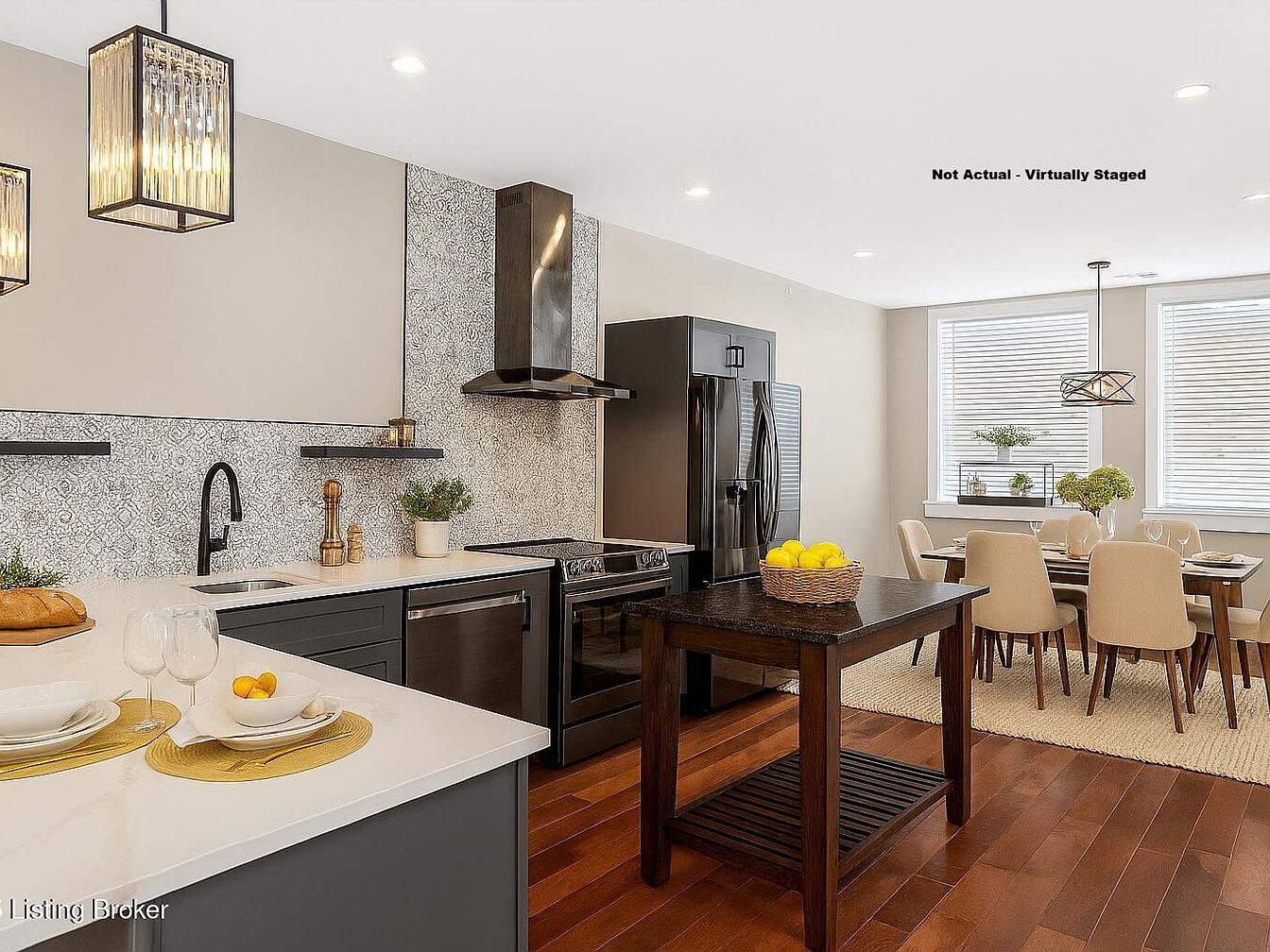 This modern kitchen features sleek cabinetry with dark gray lowers and light countertops, creating a striking contrast. The backsplash showcases intricate patterned tiles, adding texture and visual interest. Illuminated by elegant pendant lights, the space exudes sophistication. Stainless steel appliances, including a large refrigerator and stove, offer both functionality and a contemporary aesthetic. A wooden island serves as a central gathering point, topped with a basket of lemons for a pop of color. The dining area, just beyond, has light-colored chairs that complement the soft beige walls and rich hardwood flooring, enhancing the room’s warm, inviting feel.