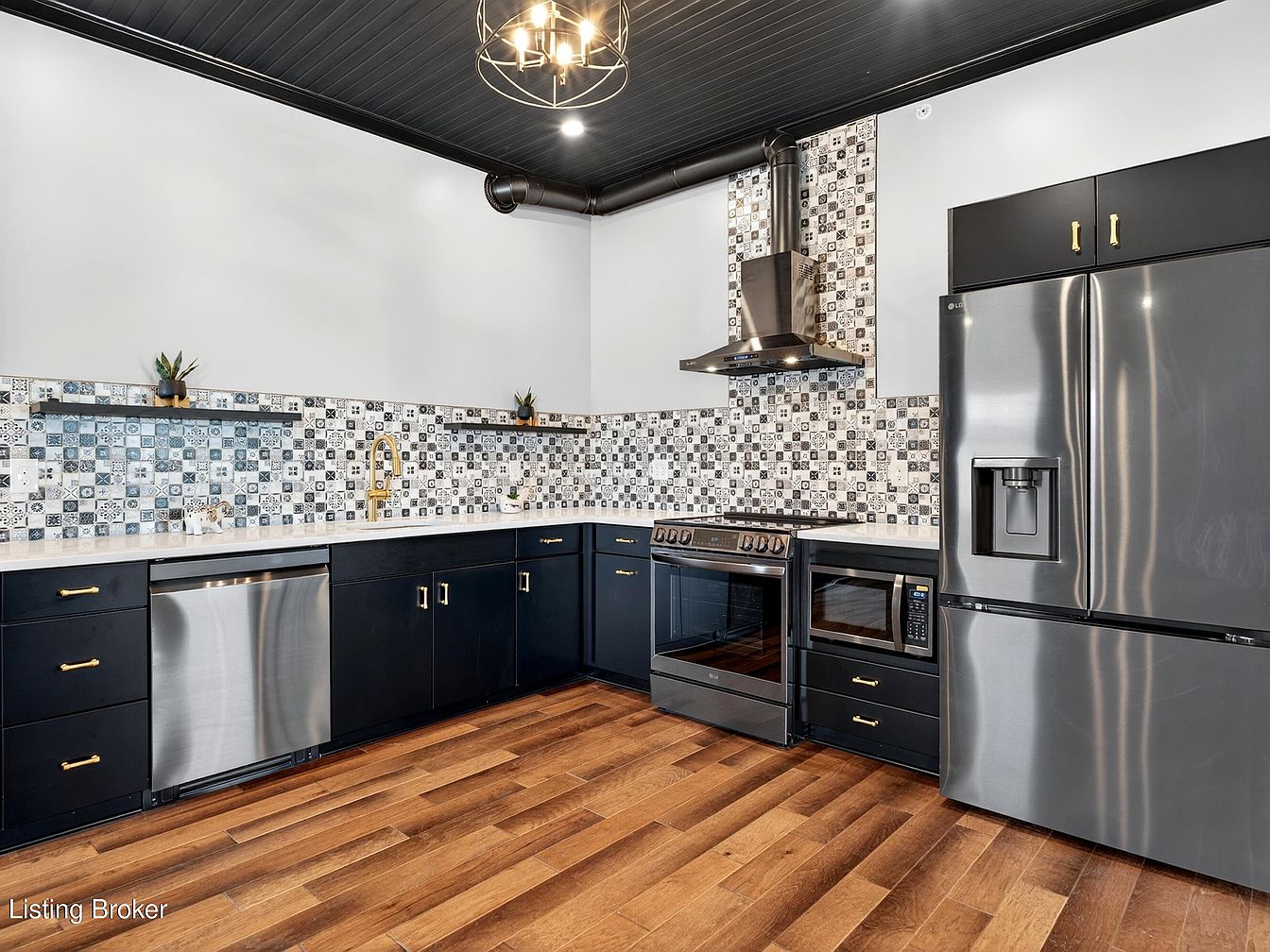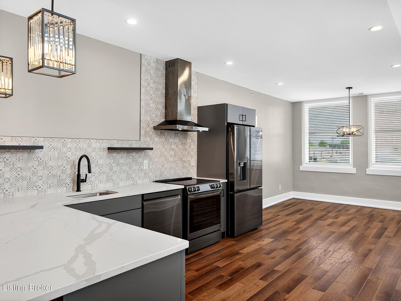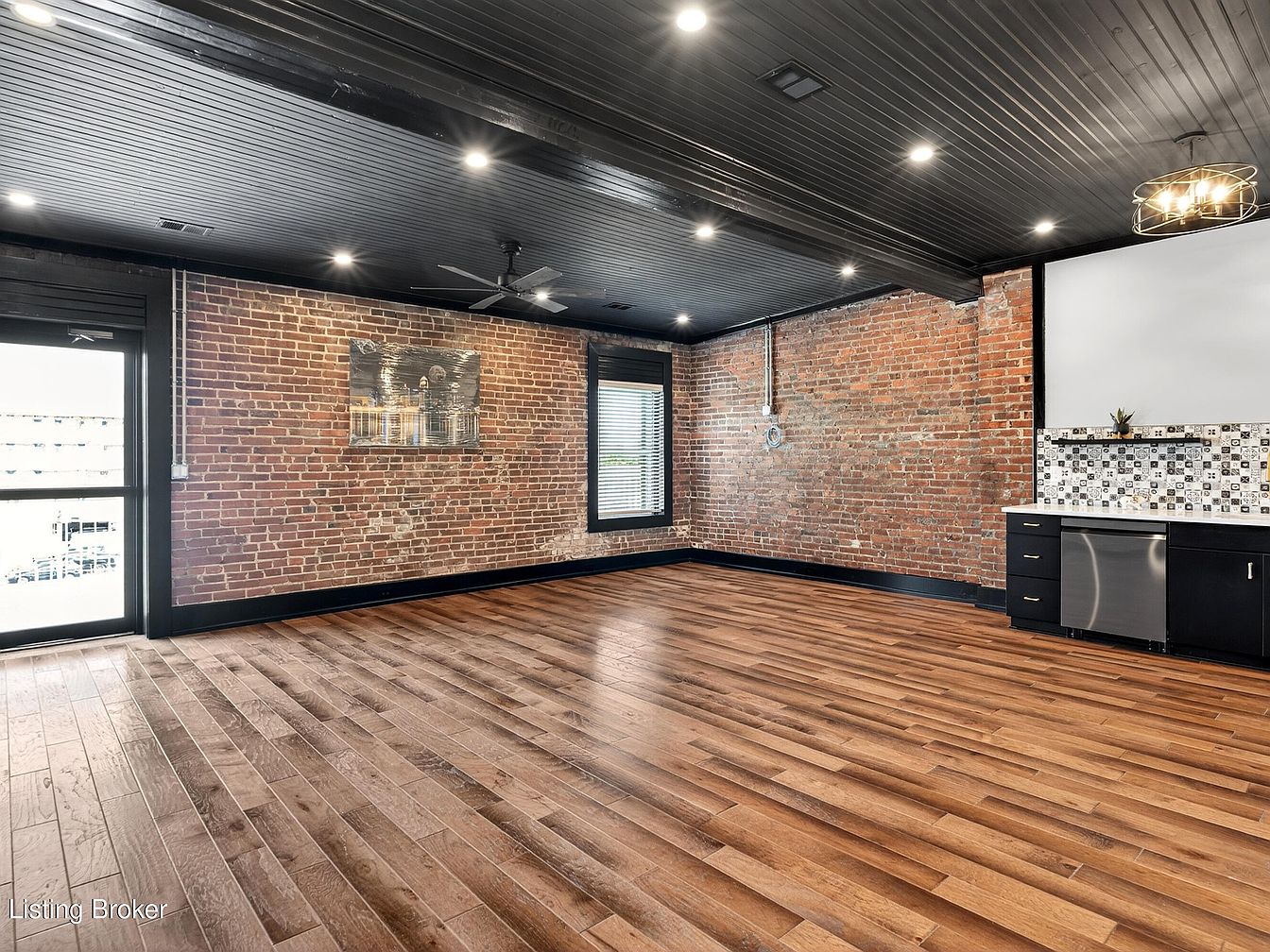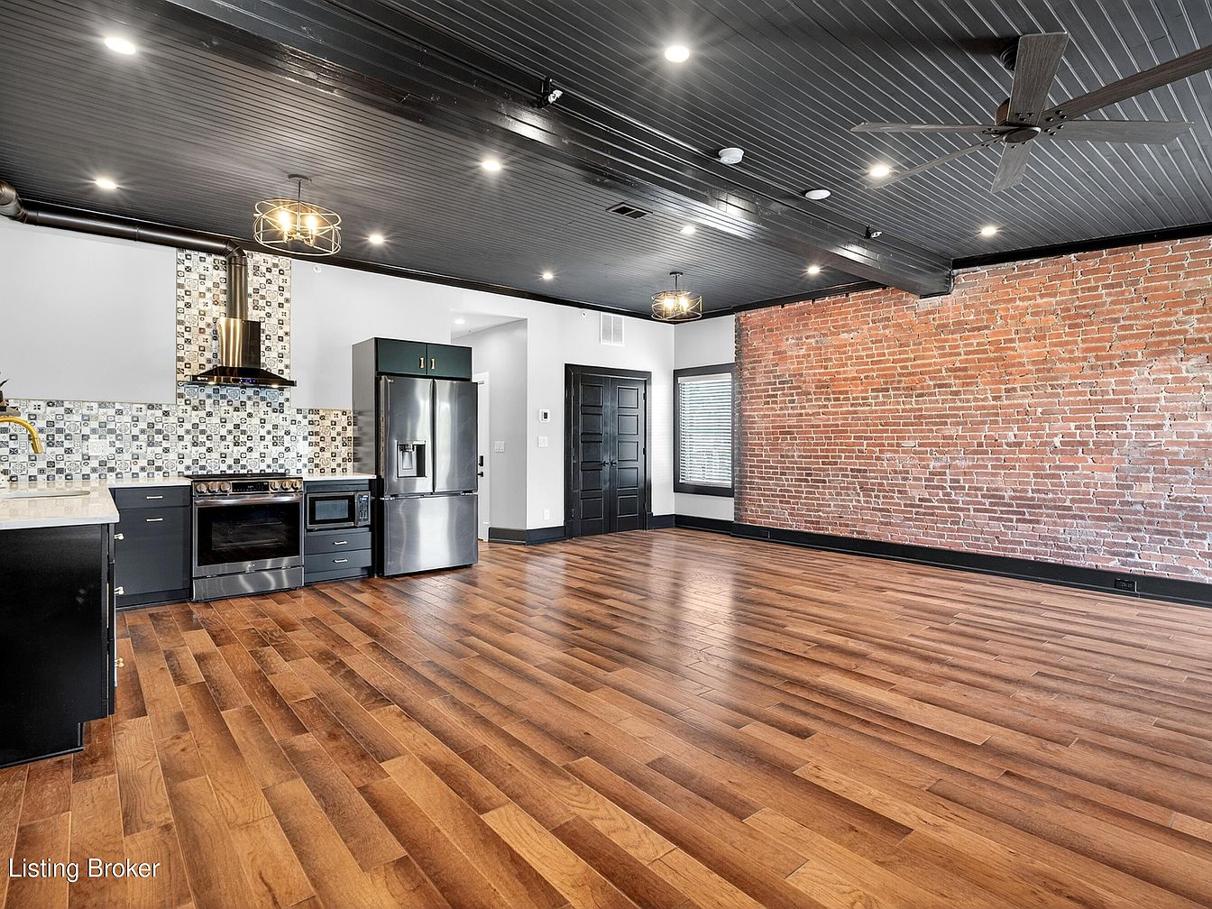 This spacious living area combines modern functionality with historic charm. The rich, warm tones of the hardwood floor contrast beautifully with the dark accent wall and sophisticated black ceiling. A striking feature is the exposed brick wall, which adds character and depth. The kitchen area showcases sleek black cabinetry and stainless-steel appliances, complemented by an intricate tiled backsplash featuring a mix of patterns. Industrial-style light fixtures hang overhead, providing ample illumination. Large windows invite natural light, enhancing the space’s openness. The overall aesthetic offers a trendy yet cozy vibe, perfectly blending contemporary and classic elements.