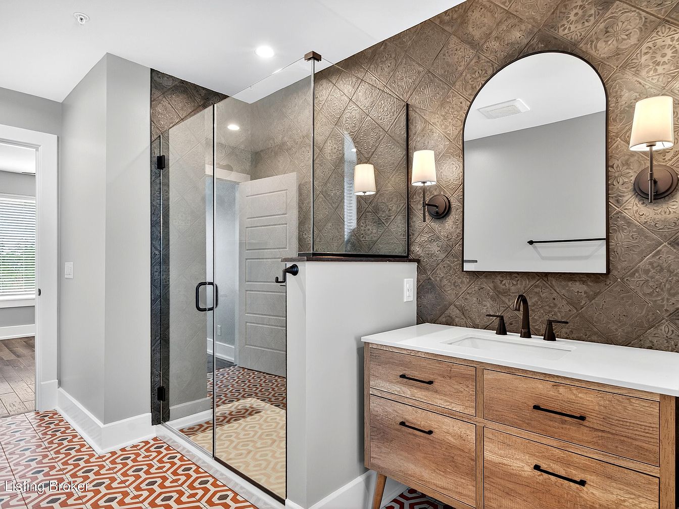 This modern bathroom features a stylish glass shower alongside a striking wooden vanity. The vanity, showcasing warm wood tones, is complemented by a sleek white countertop and modern, matte black fixtures. An arched mirror above the sink adds elegance, reflecting the intricate patterned wall tiles behind it. The textures of the tiles exhibit a sophisticated bronze hue, enhancing the space’s contemporary feel. Additionally, the bold geometric floor tiles in vibrant orange create a lively contrast, while soft sconces on either side of the mirror provide warm lighting, enhancing the inviting ambiance of the room.