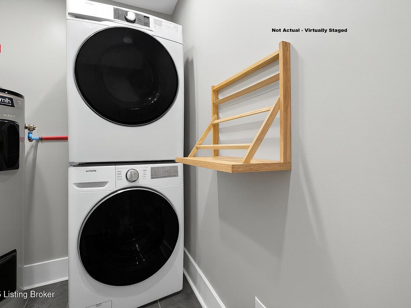 This compact laundry room features a stackable washer and dryer unit in white, positioned against a light gray wall. The sleek, modern design emphasizes simplicity, with a minimalist aesthetic. Below the dryer, a small, stylish wooden shelf with a geometric frame offers a functional display space, adding warmth and natural texture. The flooring is a darker gray tile, providing a subtle contrast to the lighter walls. An exposed plumbing line in red adds a pop of color while highlighting utility. Ample space around the appliances enhances accessibility, making this laundry area both practical and visually appealing.