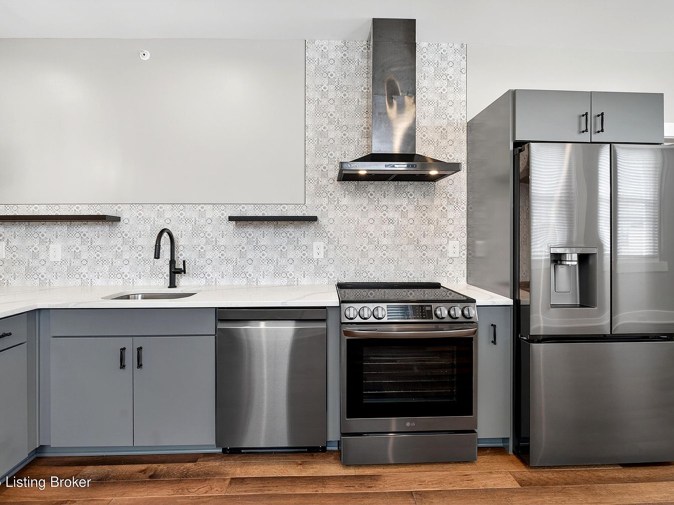 A contemporary kitchen featuring sleek, gray cabinetry with minimalist black handles. The counter space is bright with white quartz, complemented by a geometric tile backsplash adding subtle texture. Stainless steel appliances, including a gas stove with an overhead vent and a refrigerator, provide a polished look. An undermount sink with a matte black faucet is situated within the corner layout. Open shelves against the backsplash hold decorative items or kitchen essentials, enhancing functionality. Natural wood flooring warms the space, contrasting beautifully with the cool tones of the cabinetry and the backsplash, creating an inviting and stylish culinary environment.
