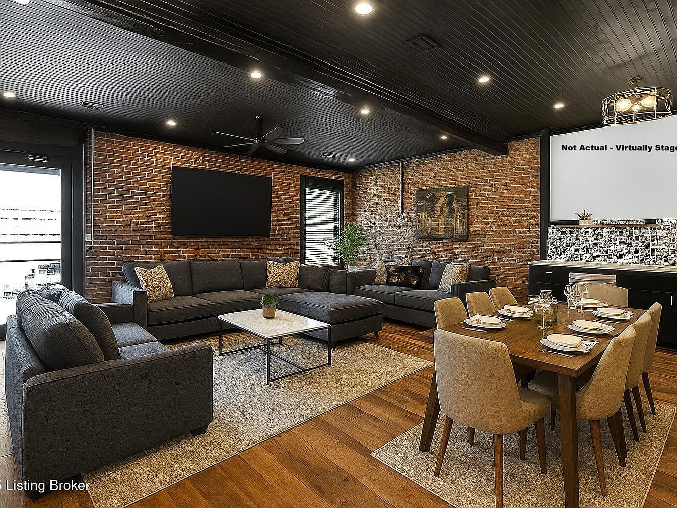 This spacious living room features a blend of modern and rustic aesthetics. Rich wooden floors contrast beautifully with exposed brick walls, lending warmth. A large, dark sectional sofa occupies one side, adorned with decorative pillows for comfort. A sleek, white coffee table rests centrally on a soft area rug. To the right, a dining area showcases a polished wooden table surrounded by upholstered chairs, elegantly set for dining. Black ceiling beams and recessed lighting add depth, while a flat-screen TV is mounted above the sectional, creating a cozy yet functional space ideal for gatherings.