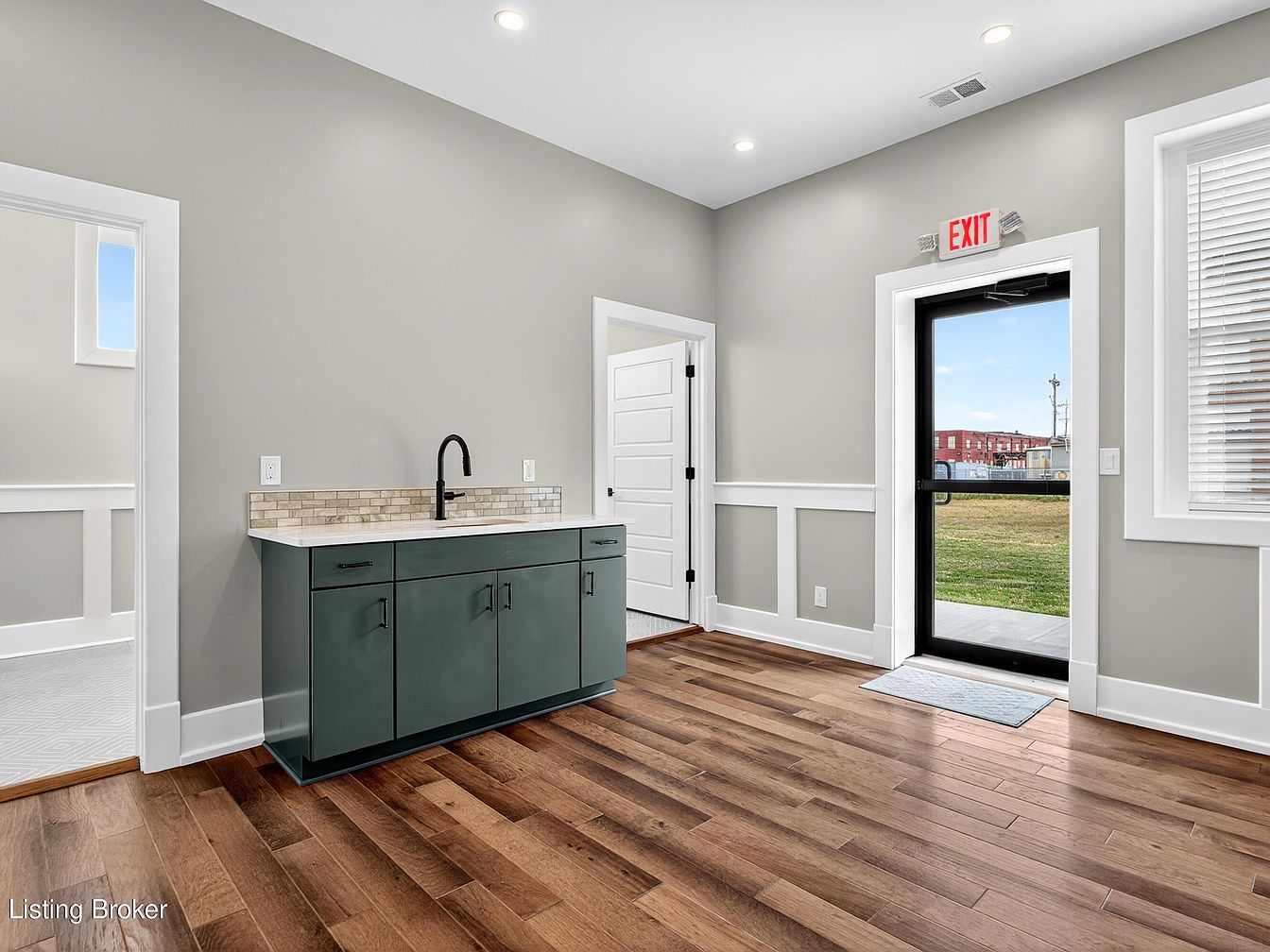This space features a stylish, modern mudroom with a sleek design. A dark green cabinetry unit pairs beautifully with a light-hued countertop, equipped with a contemporary black faucet. The wall behind the sink is adorned with small, chic tiles, adding texture. Neutral gray walls complement rich, warm hardwood flooring, enhancing the inviting atmosphere. Natural light streams through the windows, illuminating the area and highlighting the clean lines of the architecture. A door leads to an outdoor space, and practical storage solutions are integrated seamlessly. This mudroom balances functionality and aesthetics with a fresh, contemporary look.
