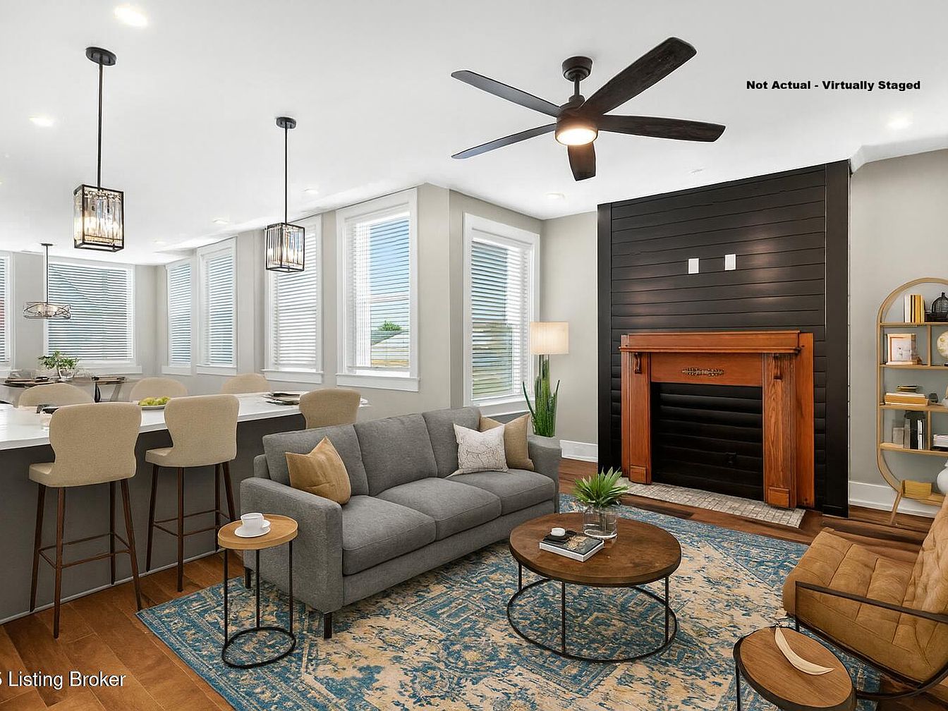 This living room features an open layout with contemporary design elements. A gray sectional sofa is complemented by a tan accent chair, creating a cozy seating area. A warm wood coffee table sits atop an ornate blue and beige rug, adding character. The striking black shiplap wall serves as a backdrop for the vintage-style fireplace, framed in rich wood. Natural light floods the room through numerous windows adorned with sleek blinds. Stylish pendant lights and a ceiling fan enhance the airiness, while cheerful greenery and decorative pieces on a round shelf contribute to a welcoming atmosphere.