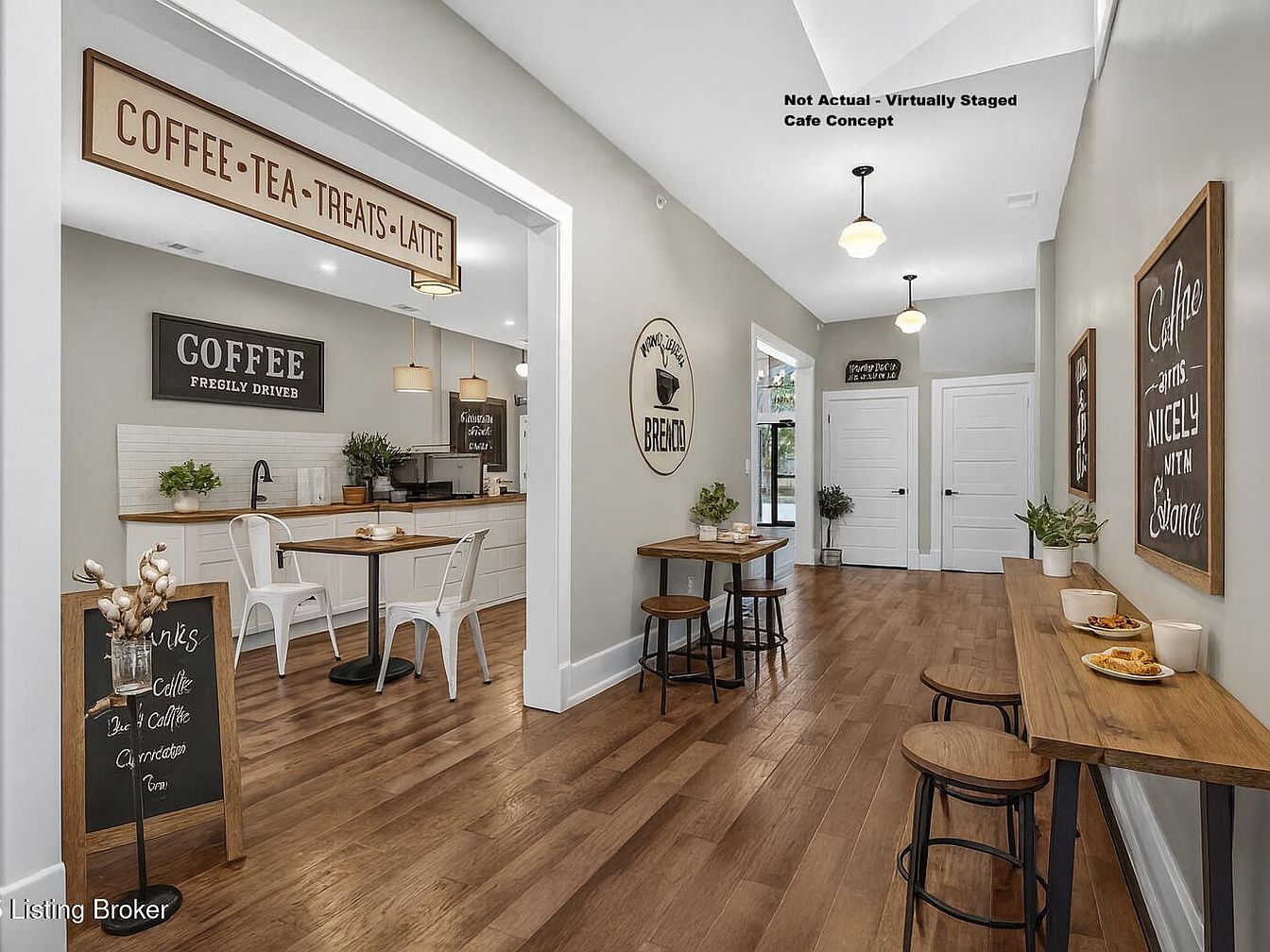 This cozy café area features a warm, inviting layout with sleek wooden floors and a light gray wall color, enhancing a modern aesthetic. The space is centered around a small table with two white chairs, perfect for casual gatherings. On the left, a stylish coffee counter showcases minimalist cabinetry with a coffee machine and potted plants, adding a touch of greenery. Decorative signage, including ‘Coffee’ and ‘Tea,’ adorns the walls, while large windows allow natural light to flood in. Two wall-mounted wooden tables with stools invite patrons to enjoy treats, emphasizing a friendly and social atmosphere.