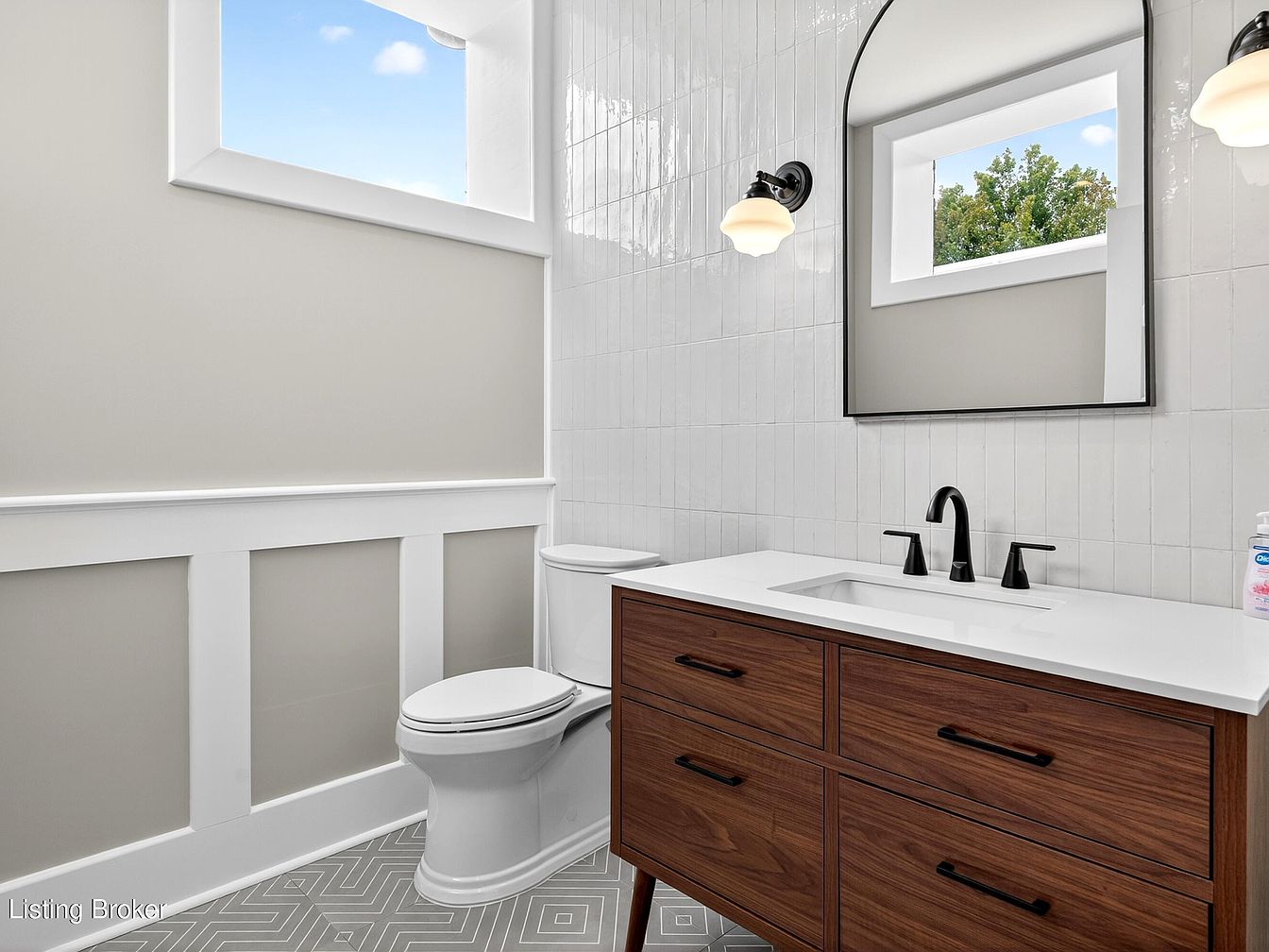 A well-designed bathroom featuring a blend of modern and classic elements. The light beige walls are complemented by white wainscoting that adds depth. A sleek, dark wooden vanity contrasts beautifully with the white countertop, featuring a minimalist sink and black faucets. The wall is adorned with glossy white tiled accents, enhancing the room’s brightness. An arched mirror above the sink reflects natural light from a strategically placed window, highlighting the lush greenery outside. The floor showcases a subtle geometric pattern in gray, creating a visually appealing foundation that ties the design together.