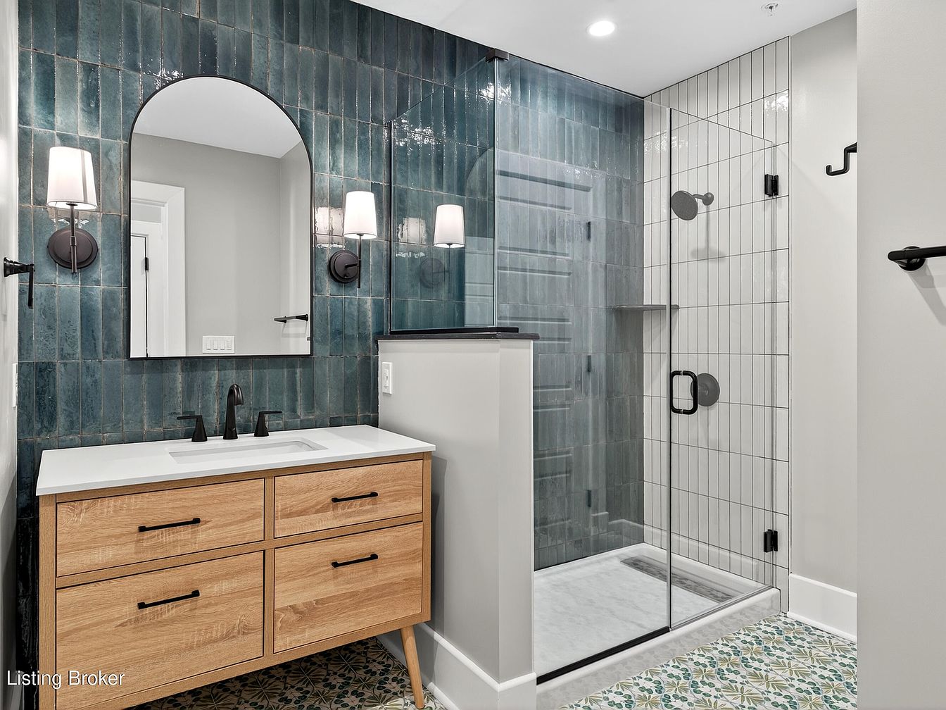 This modern bathroom features a striking combination of design elements. A large, arched mirror hangs over a stylish wooden vanity with four spacious drawers, adding warmth. The wall behind the sink is adorned with deep blue, textured tiles that create a dramatic backdrop, contrasted by the sleek white countertop. Two black sconces provide soft lighting, complementing the dark fixtures. A glass-enclosed shower showcases vertical white tiles, with a stylish black showerhead, enhancing the modern aesthetic. The floor is decorated with intricate, colorful tiles, introducing a playful touch. Clean lines and a neutral color palette emphasize contemporary elegance.