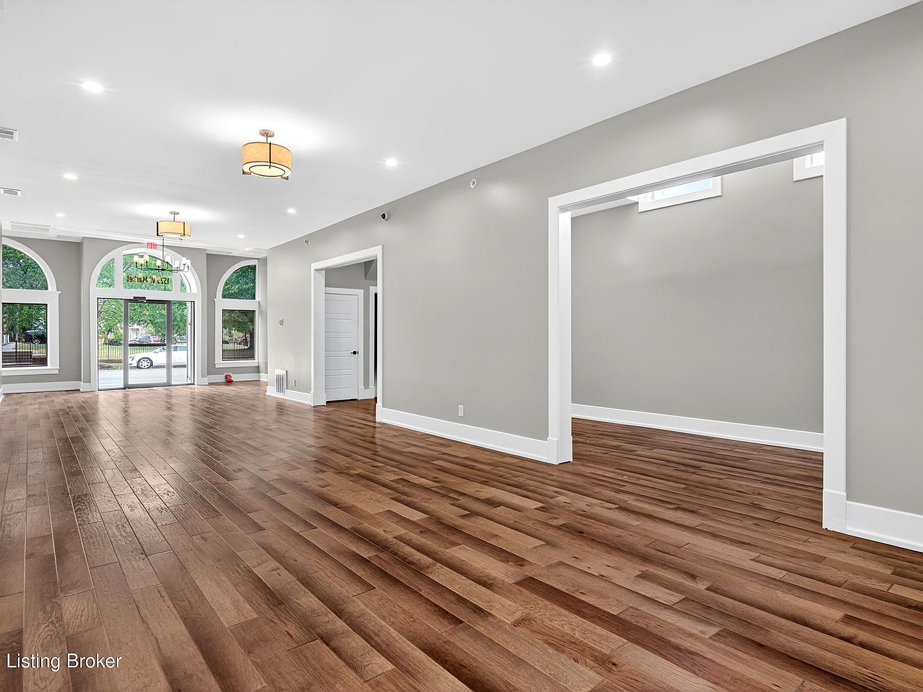 This expansive living room features an open layout with rich, polished hardwood flooring that enhances its warmth. The walls are painted a soft gray, creating a neutral backdrop that complements the ample natural light pouring in through large arched windows. Two elegant light fixtures hang overhead, adding a touch of sophistication. The room is divided by a classic white archway, leading to additional spaces, while a subtle door and vent remain unobtrusive. The overall aesthetic is modern yet timeless, making it suitable for various decor styles, from minimalist to traditional.