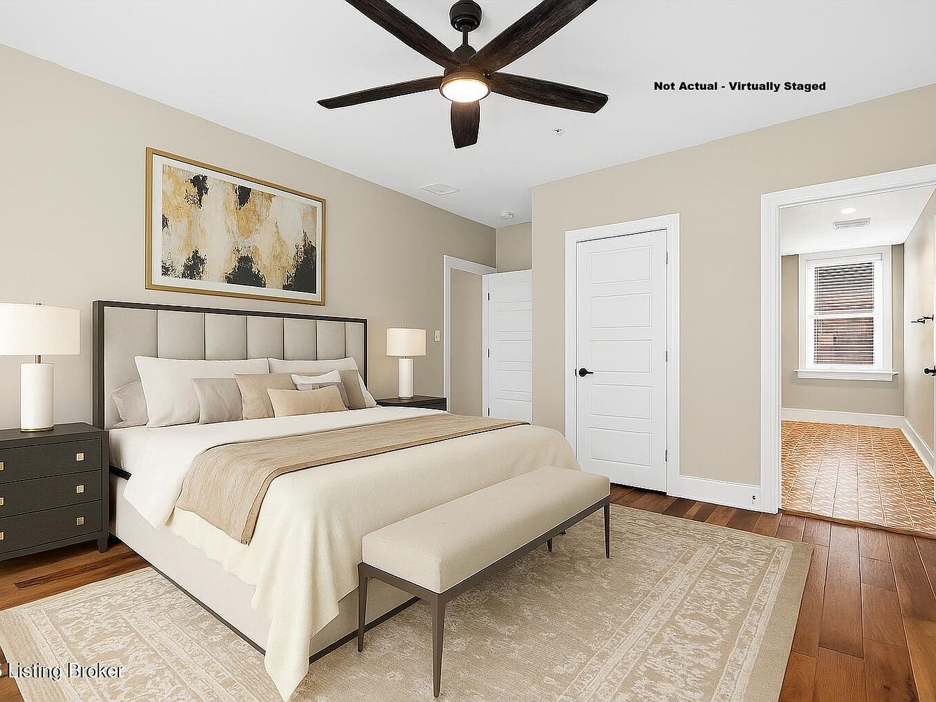 A well-designed bedroom showcases a serene and modern aesthetic. The neutral beige walls are complemented by a plush, upholstered headboard framing the bed, which is adorned with soft, layered bedding in cream and taupe tones. On either side, sleek nightstands hold elegant table lamps casting a warm glow, enhancing the tranquil ambiance. Rich wooden flooring adds warmth, and a delicate area rug underfoot introduces subtle texture. A contemporary ceiling fan keeps the space comfortable, while artwork on the wall adds a touch of sophistication. The room features multiple doors, leading to a well-lit area, suggesting practical layout and thoughtful design.