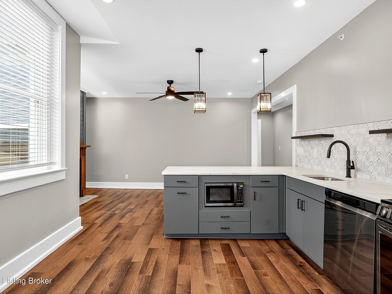 This modern kitchen features a spacious layout with sleek gray cabinetry and a clean, minimalist design. A contrasting white countertop stretches elegantly across the island and perimeter, enhancing its contemporary feel. The floor showcases rich, warm wood tones that complement the overall aesthetic. Elegant pendant lights hang above the island, adding warmth and charm. The back wall is adorned with a decorative tile backsplash, providing textural interest. Large windows allow natural light to flood the space, while a ceiling fan adds comfort. The room conveys a harmonious blend of functionality and style, perfect for both cooking and entertaining.