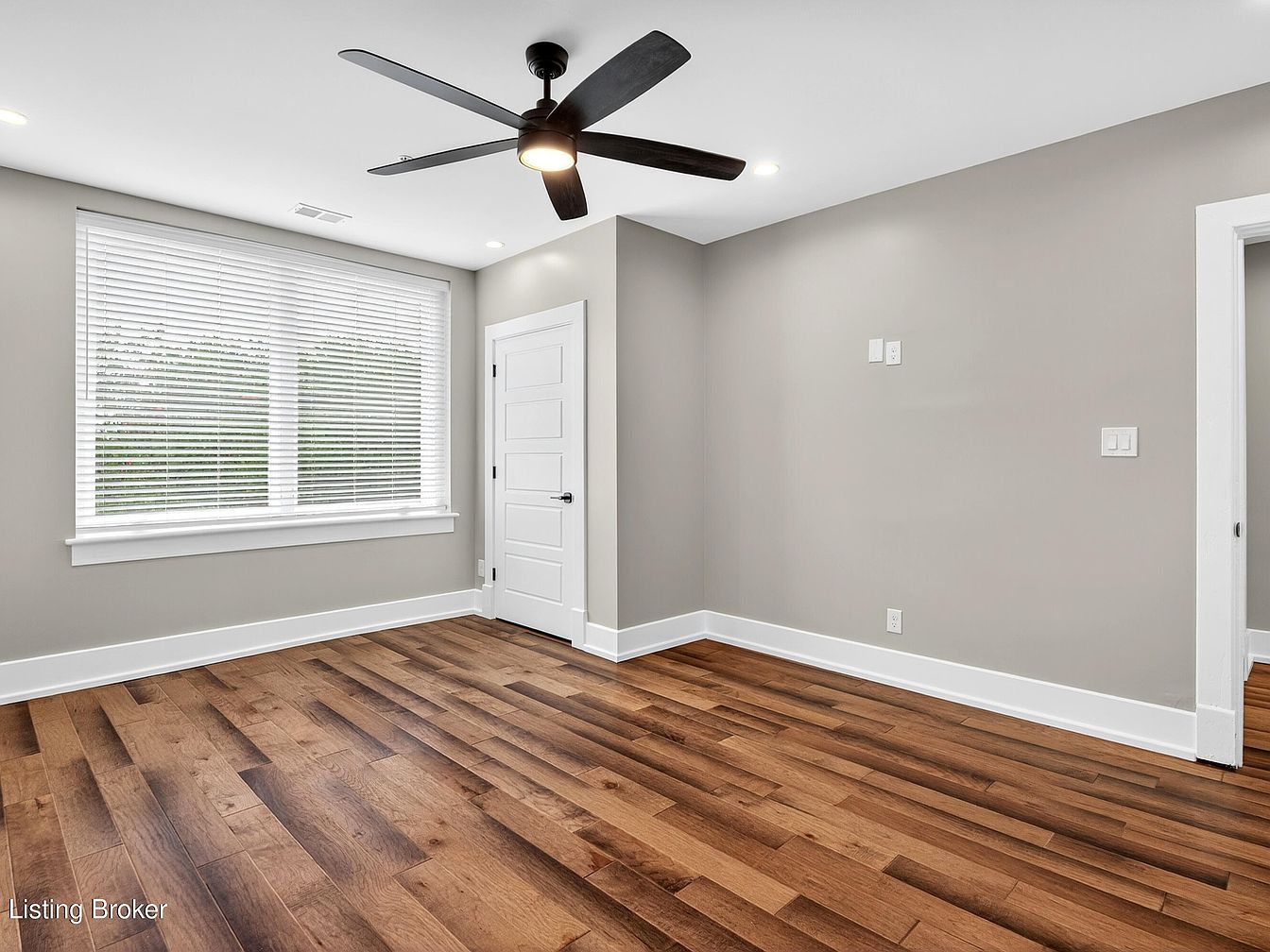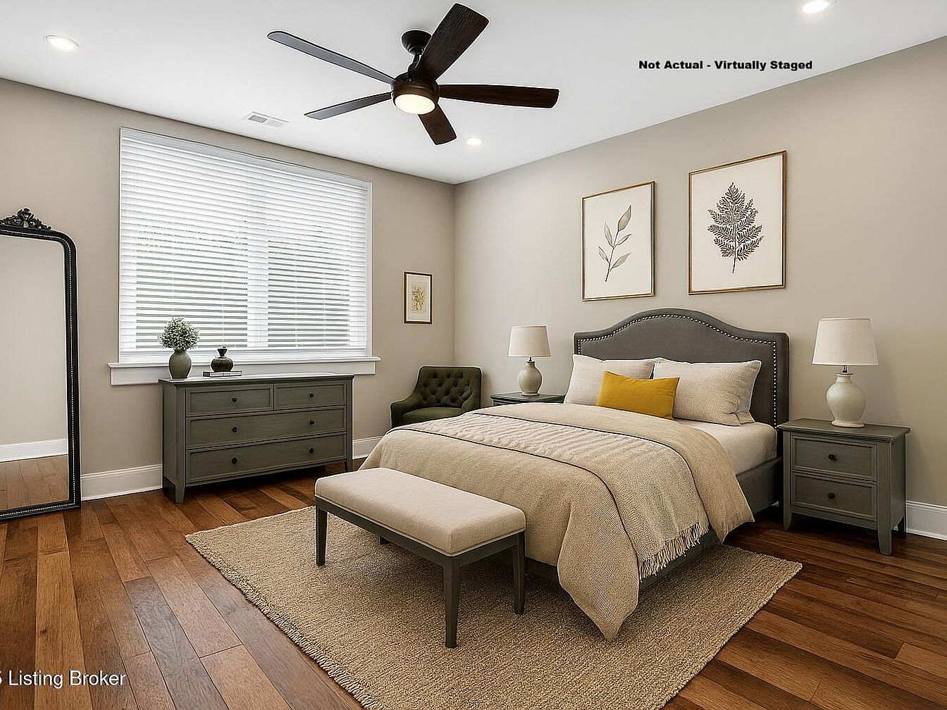 This bedroom space features a soft gray wall color that offers a tranquil ambiance. Natural light streams through a large, multi-paned window adorned with white blinds, enhancing the brightness of the room. The sleek, dark ceiling fan adds a modern touch, harmonizing with the overall contemporary aesthetic. Hardwood flooring in rich tones of brown complements the simple yet elegant white trim around the windows and the door. A closed door on the right provides access to another space, while the layout is designed for both comfort and functionality, creating a cozy retreat ideal for rest and relaxation.