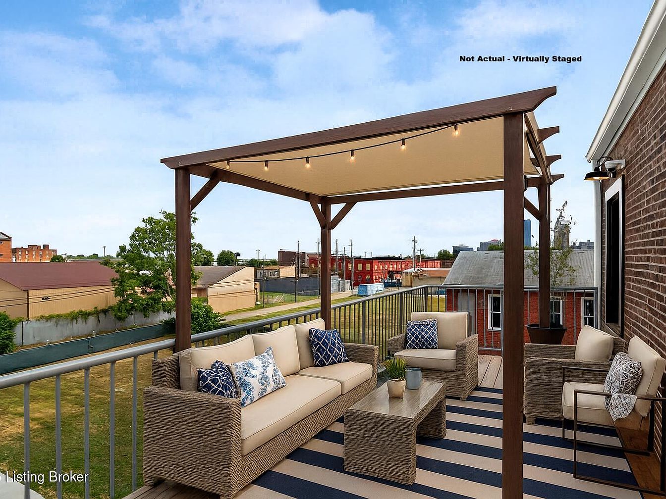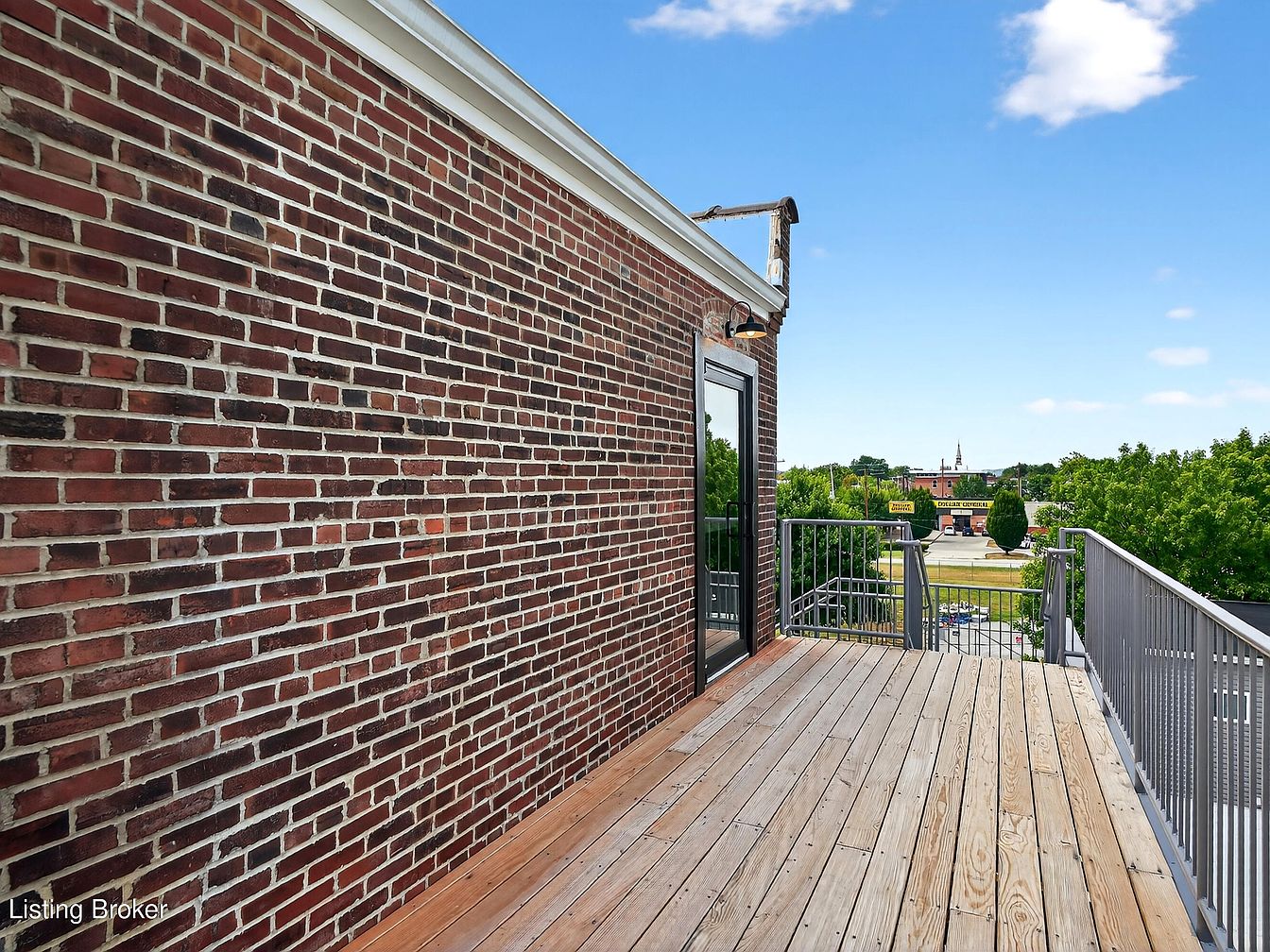 A spacious rooftop deck offers a stunning view of the surrounding landscape. The exposed red brick wall showcases a rustic charm, contrasting beautifully with the smooth wooden flooring. The deck features a simple yet elegant railing that enhances safety while maintaining an open feel. Sunlight complements the warm tones of the wood and brick, creating a welcoming atmosphere. Beyond the railing, lush trees and buildings can be seen, adding depth to the scene. This outdoor space is perfect for relaxation or entertaining, inviting leisurely moments while enjoying scenic vistas.