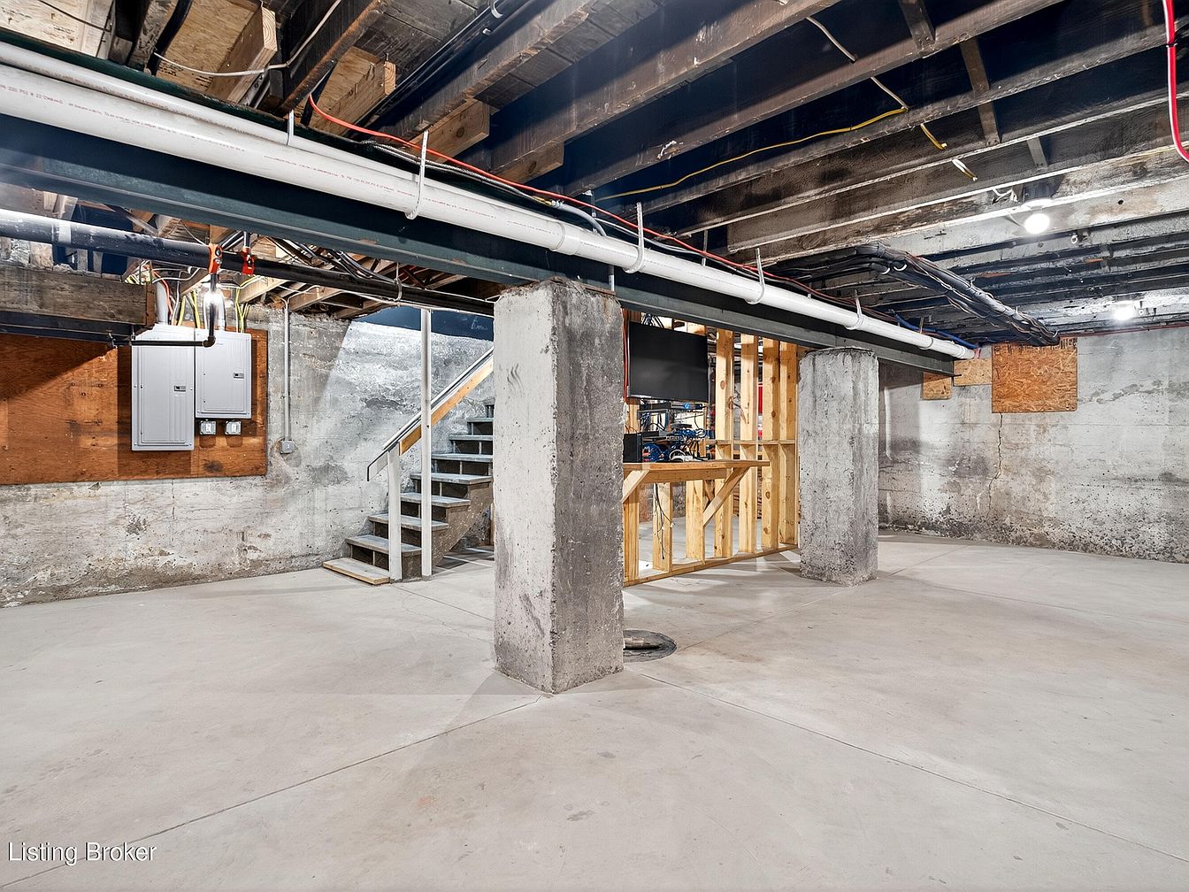 Spacious basement area featuring a raw concrete floor and exposed beams overhead, highlighting its utilitarian charm. The walls are primarily unadorned concrete, with a couple of panels suggesting previous utility modifications. A neatly constructed wooden staircase leads up, showcasing modern handrails and an inviting design. Power panels are mounted on the left wall, indicating functionality. Two cylindrical concrete columns provide structural support, enhancing the industrial aesthetic. Soft overhead lighting offers visibility, while the organized appearance of pipes and electrical wiring adds a hint of contemporary infrastructure. Overall, the space exudes potential for personalization and utility.