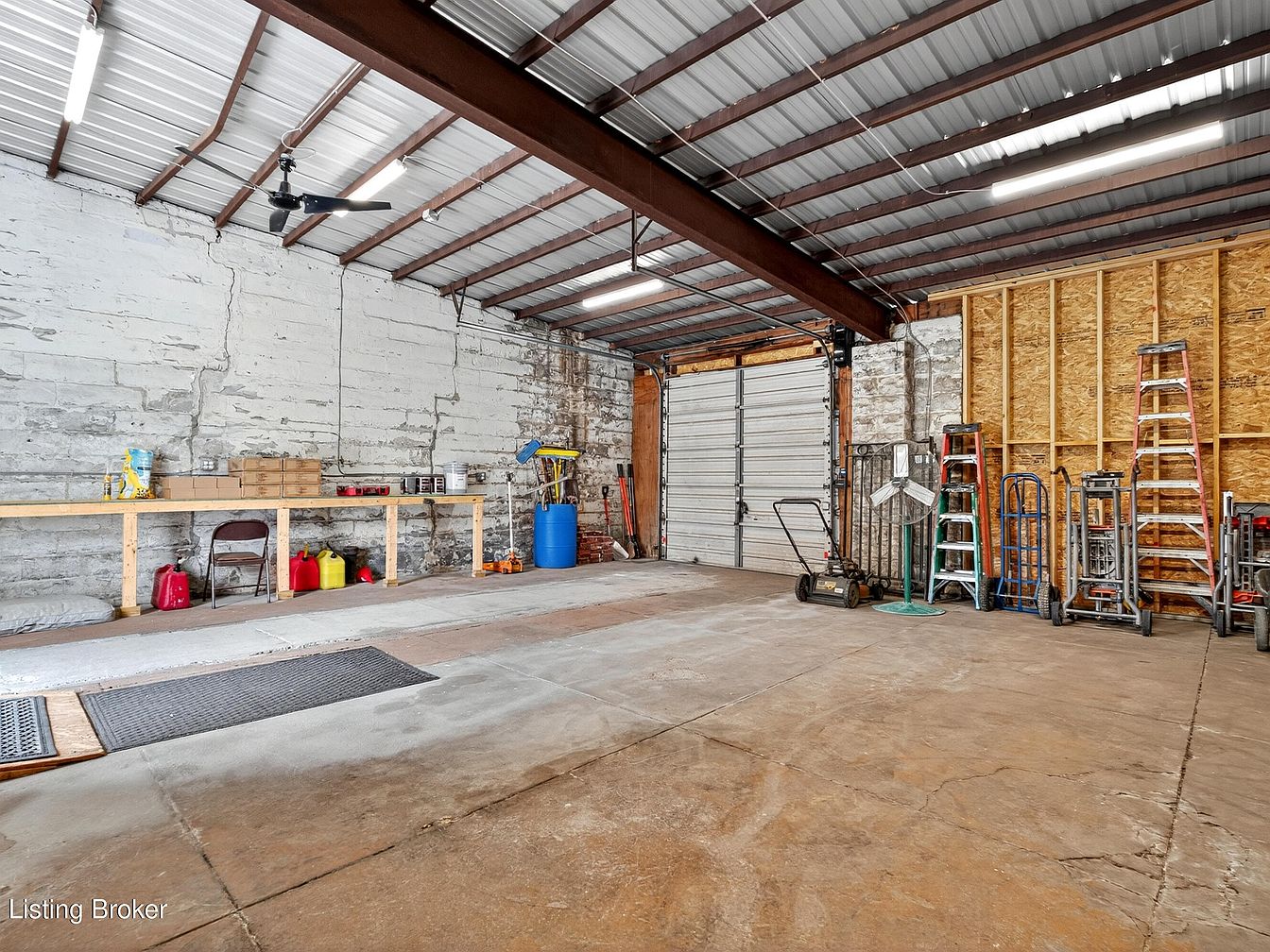Spacious garage with a rugged aesthetic featuring exposed stone walls and a metal ceiling. The concrete floor, showing signs of wear, adds to the utilitarian feel. A large, functional workbench runs along one side, equipped with basic tools and storage containers. Several ladders and rolling carts are organized against the walls, contributing to a sense of order. Natural light filters through a large garage door, paired with overhead fluorescent lighting, ensuring a bright working environment. The overall color scheme is neutral, with shades of gray and brown, creating a practical and efficient workspace for various projects.