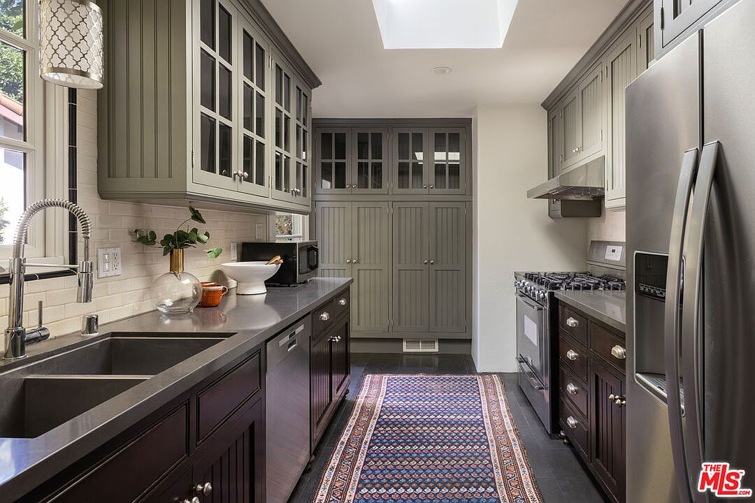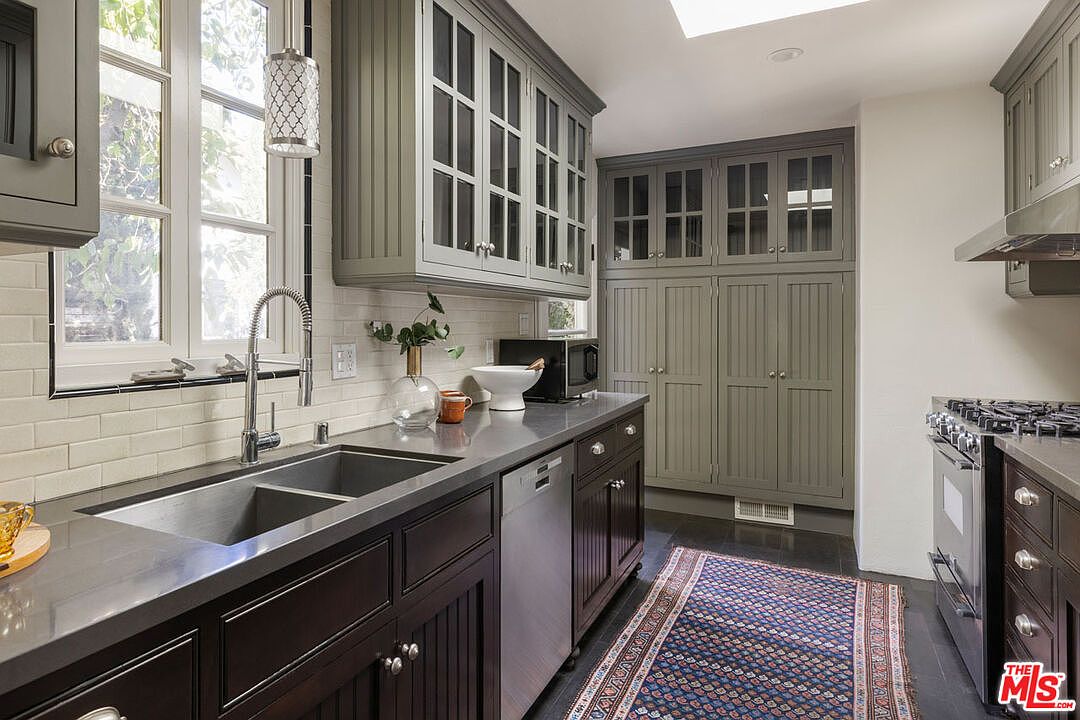 A galley-style kitchen with tall beadboard cabinetry painted in a muted sage green. Glass-front upper cabinets provide display space, while lower cabinets are finished in a rich espresso tone. Sleek grey stone countertops run along both sides, featuring an undermount double sink and a modern pull-down faucet beneath a trio of large windows letting in natural light. The backsplash is comprised of cream subway tiles. Stainless steel appliances, including a stove and dishwasher, complement the look. A vintage-style runner rug with intricate patterns adds warmth and color to the dark tiled floor. Minimal decor and greenery accent the space.