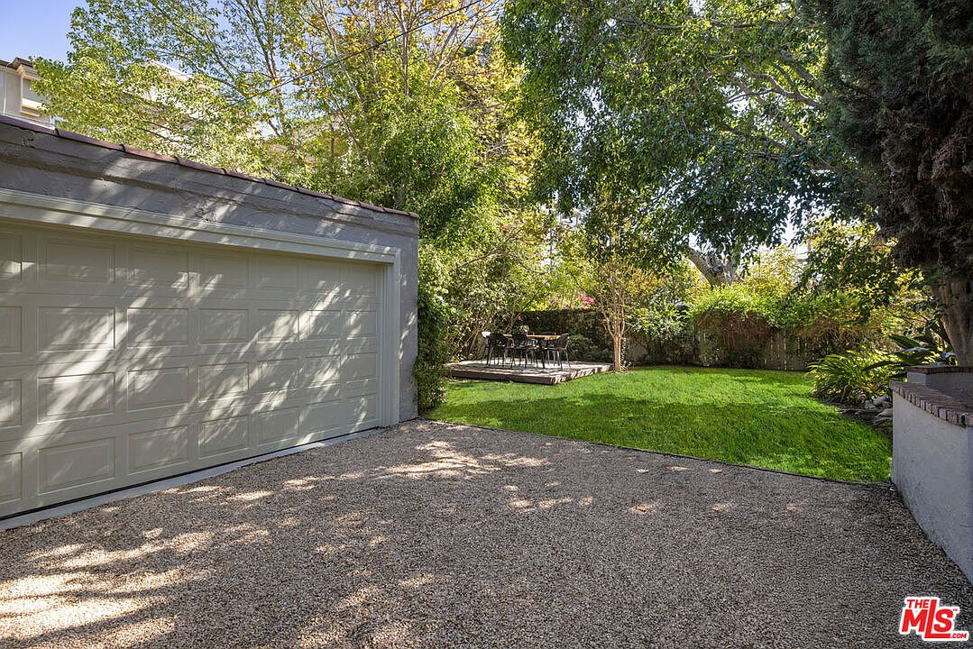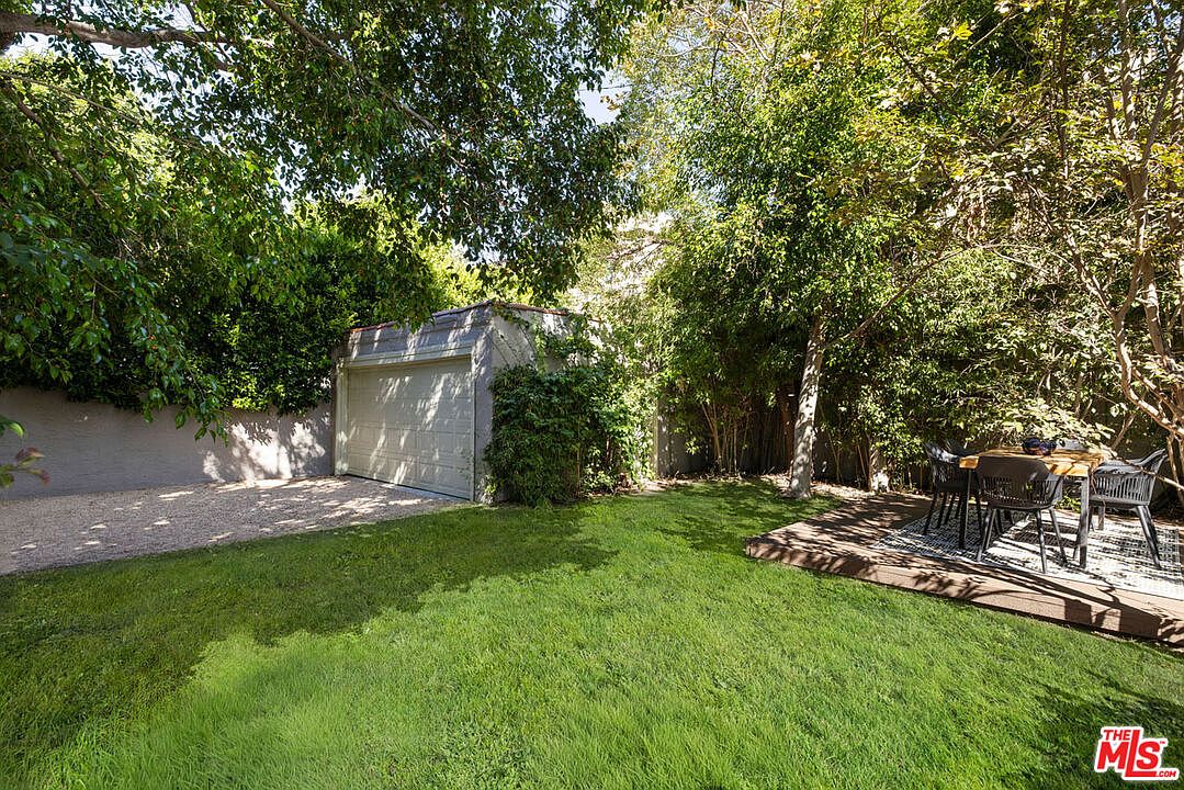 A sun-dappled backyard space with a detached garage featuring a pale cream door and simple, clean lines. The driveway is covered in small light beige gravel, creating a textured surface that contrasts with the vibrant green of the manicured lawn. To the right, large leafy trees provide ample shade and a lush, tranquil ambiance. Nestled in the back corner is a small raised wooden deck furnished with a modern black dining set, perfect for outdoor gatherings. Dense surrounding foliage and privacy shrubs frame the yard, enhancing the peaceful, secluded feel of this outdoor retreat.