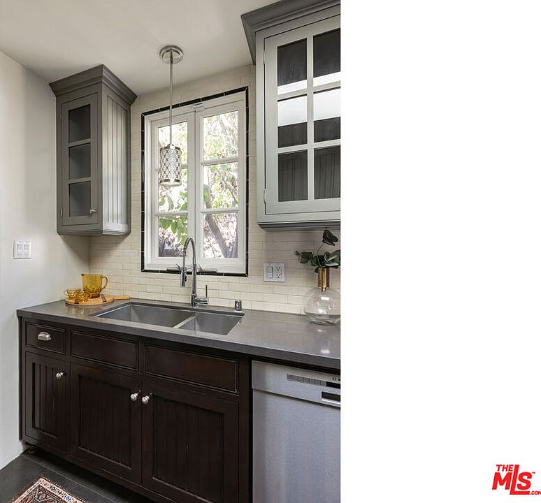 The kitchen sink area features a blend of classic and modern elements. A deep, double-basin stainless steel sink sits beneath a multi-pane window that allows natural light to flood the space, with green foliage visible outside. The cabinetry below is rich, dark wood, accented with round metal knobs and subtle beadboard detailing. Above, contrasting grey upper cabinets with glass-paneled doors offer both storage and display space. The countertops are a smooth, medium grey, complemented by subway tile backsplash in a warm cream tone. Delicate pendant lighting and minimalist hardware contribute to the clean, sophisticated aesthetic, while a small plant and yellow glassware add warmth.